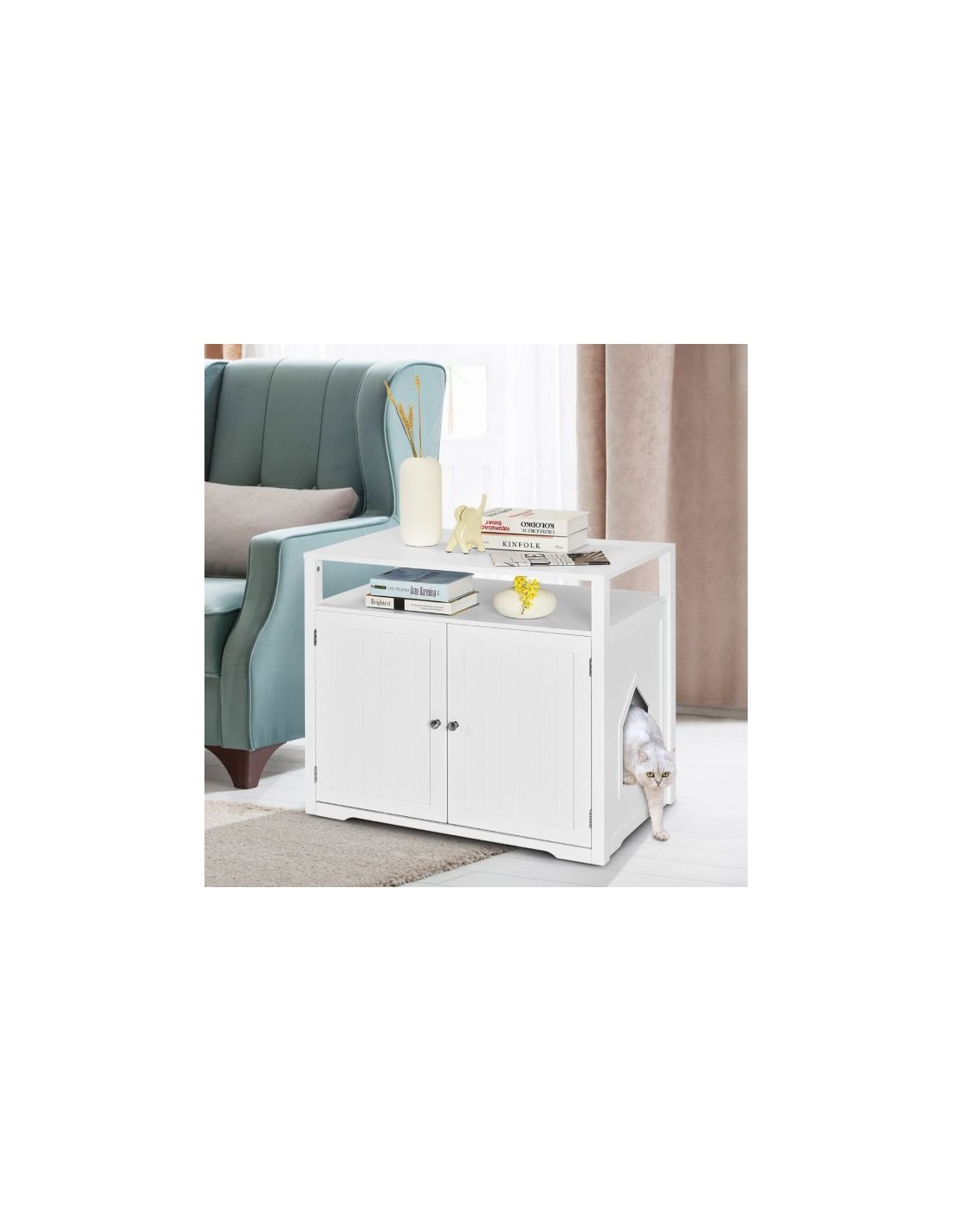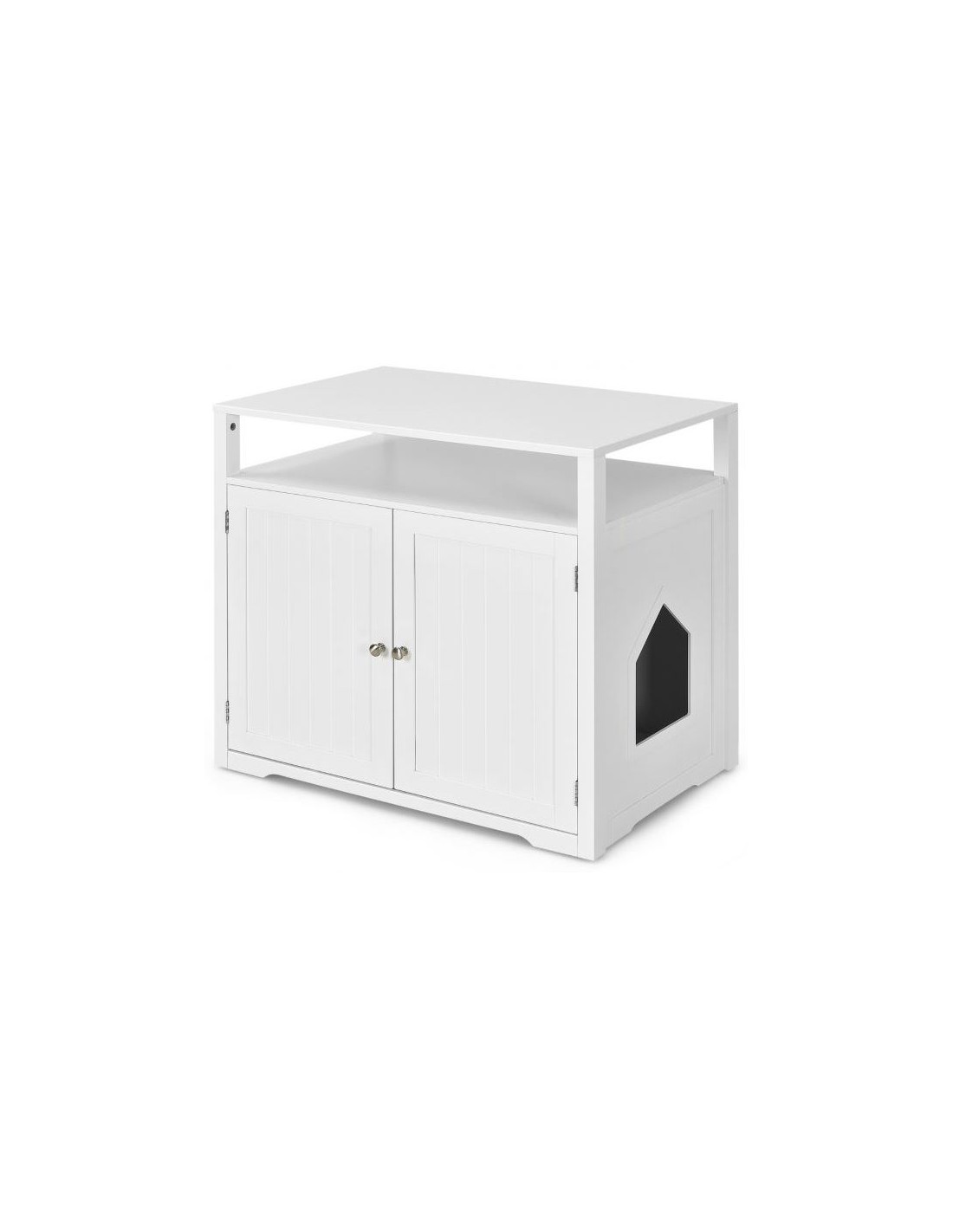 Kattehus udført i et design af træ. Kattehuset måler 71 cm i højden og 80 x 53,5 cm i bredde og dybde. Vi anbefaler ikke at møblet står udendørs når der er fugt eller regnvejr.
