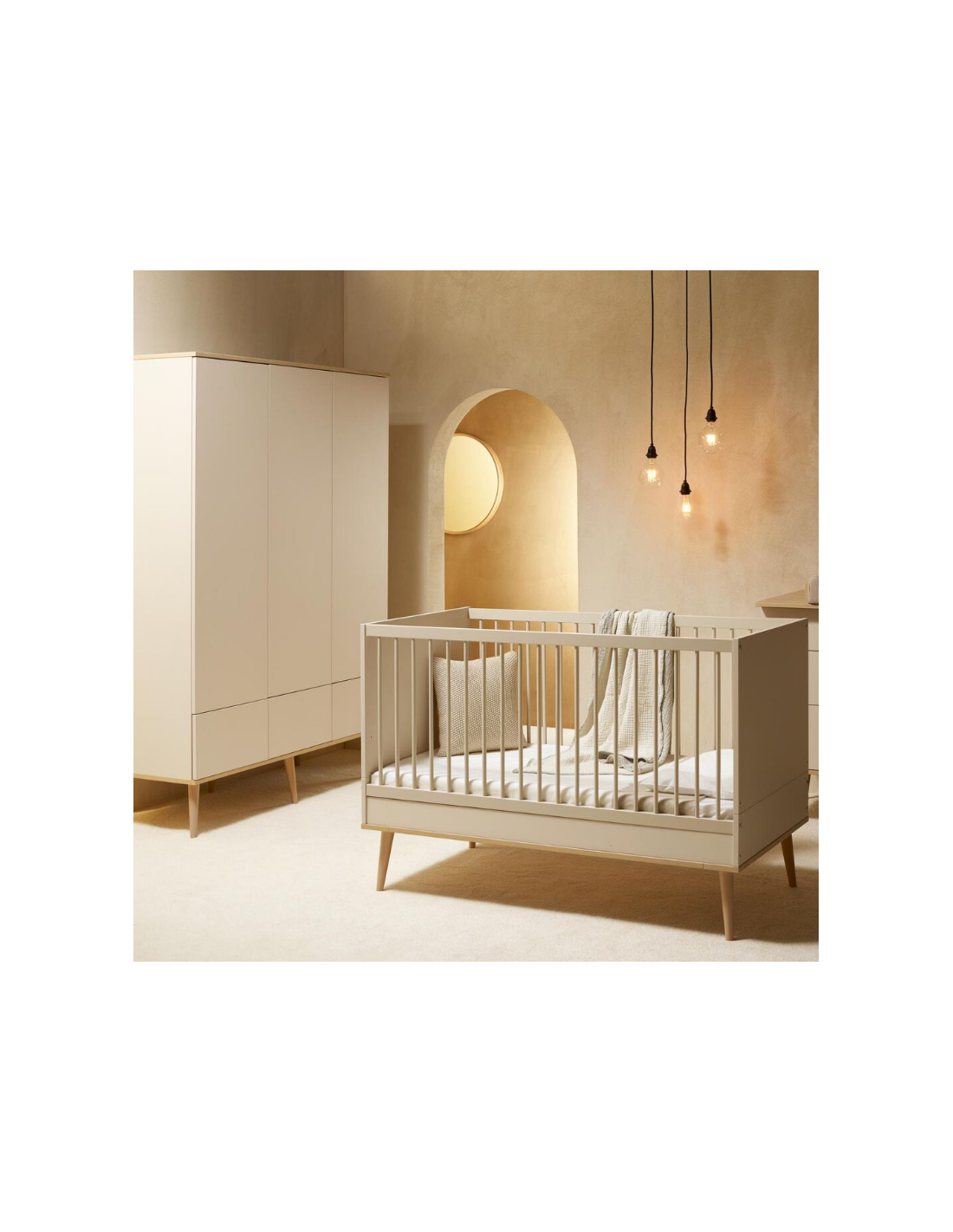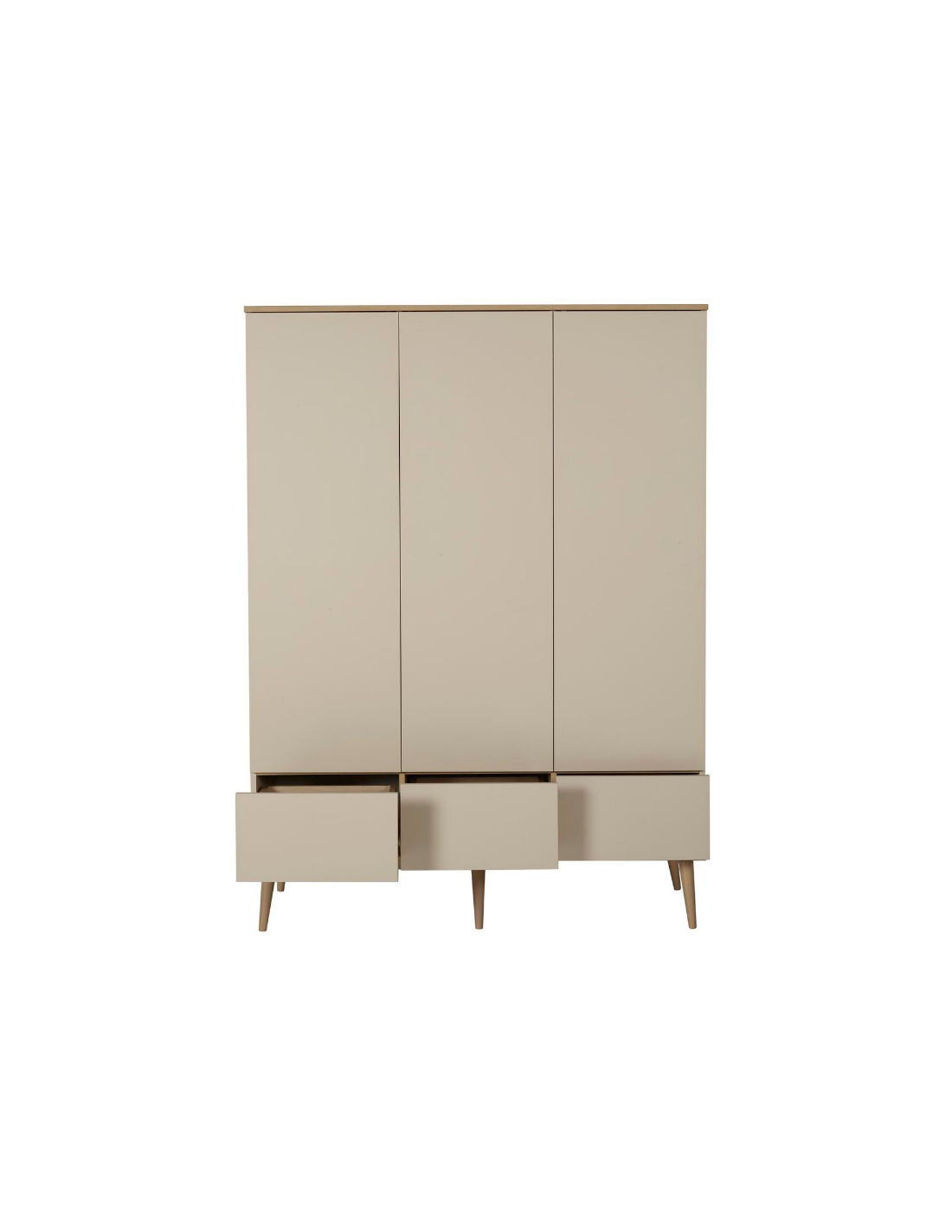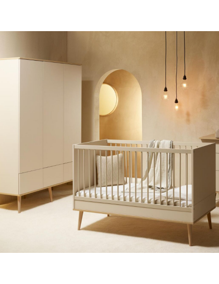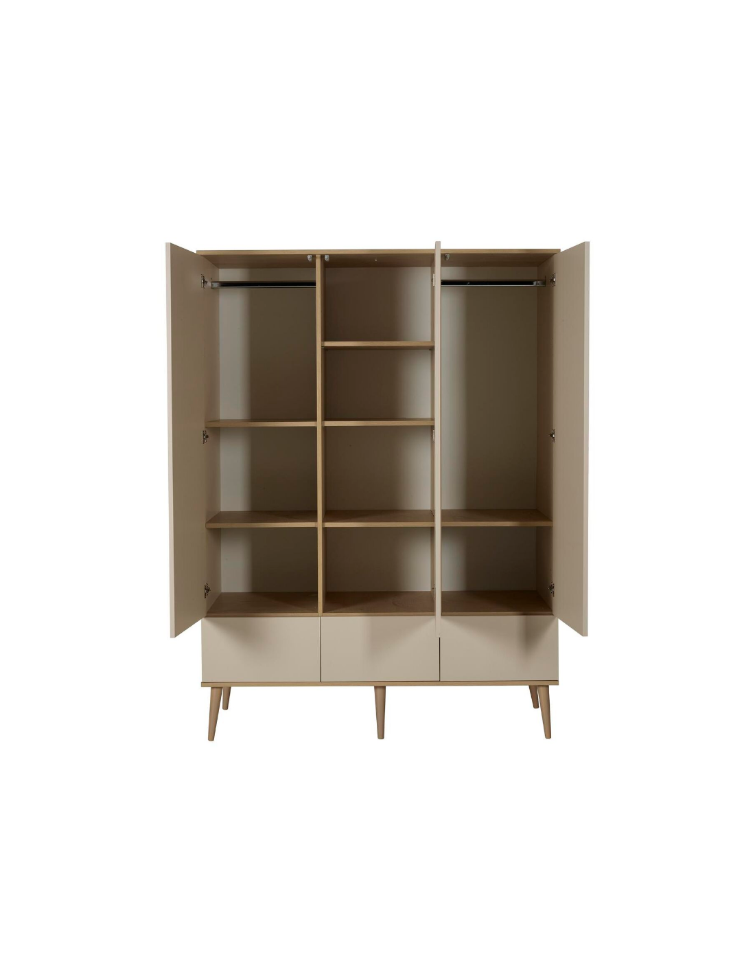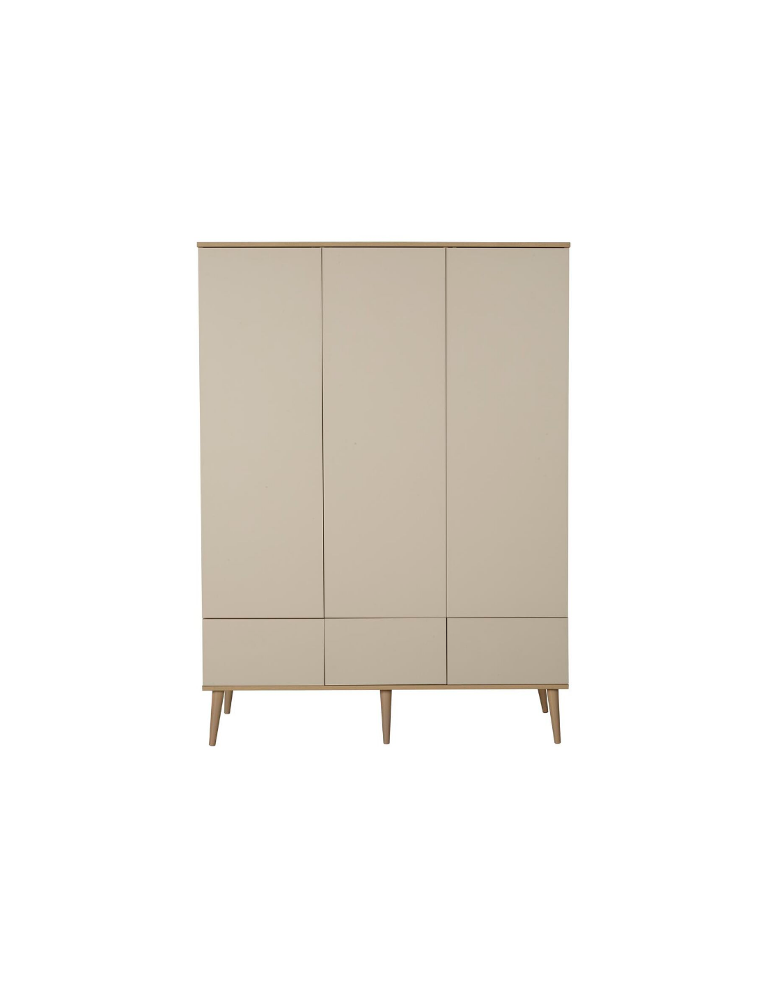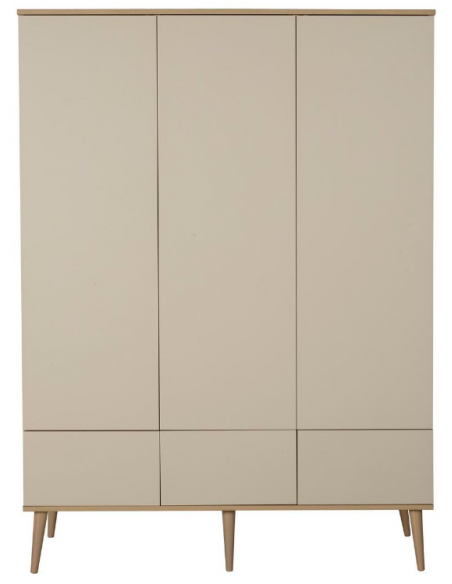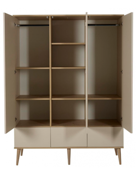 FLOW Klædeskab til børneværelset fra Belgiske Quax, udført i et moderne design og fremstillet i lækre materialer. Klædeskabet måler 198 x 144 cm i højde og bredde. Skabet er indrettet med hylder og bøjlestang, der kan opsættes efter ønske. Hertil 3 skuffer med push-funktion. Inddelingen kan også opsættes efter voksenbehov.