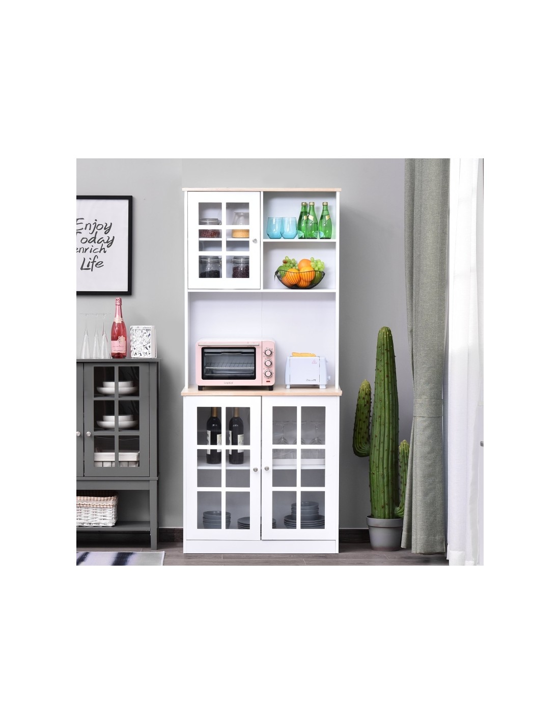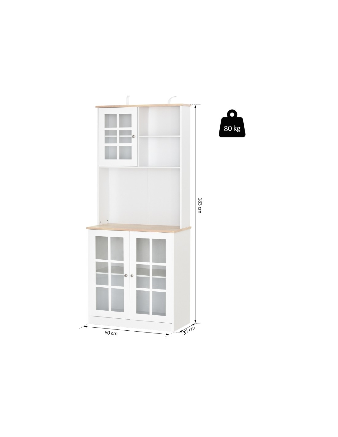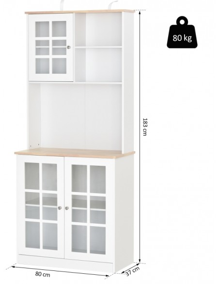 Køkkenskab udført i et design af MDF og glas. Skabet måler 80 x 37 cm i bredde og dybde og 183 cm i højden. Skabet indeholder 3 åbne hylderum, 1 skab med 2 hylderum samt 1 dobbeltskab med 2 hylderum.