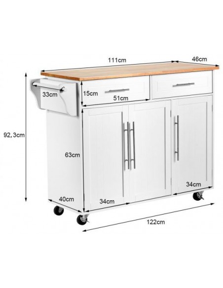 Køkkenskab eller serveringsvogn udført i et design af mdf og træ. Serveringsvognen måler 92,3 cm i højden og 111 x 46 cm i bredde og dybde. Vognen indeholder 2 skuffer samt 3 skabe med højdejusterbar hylde.