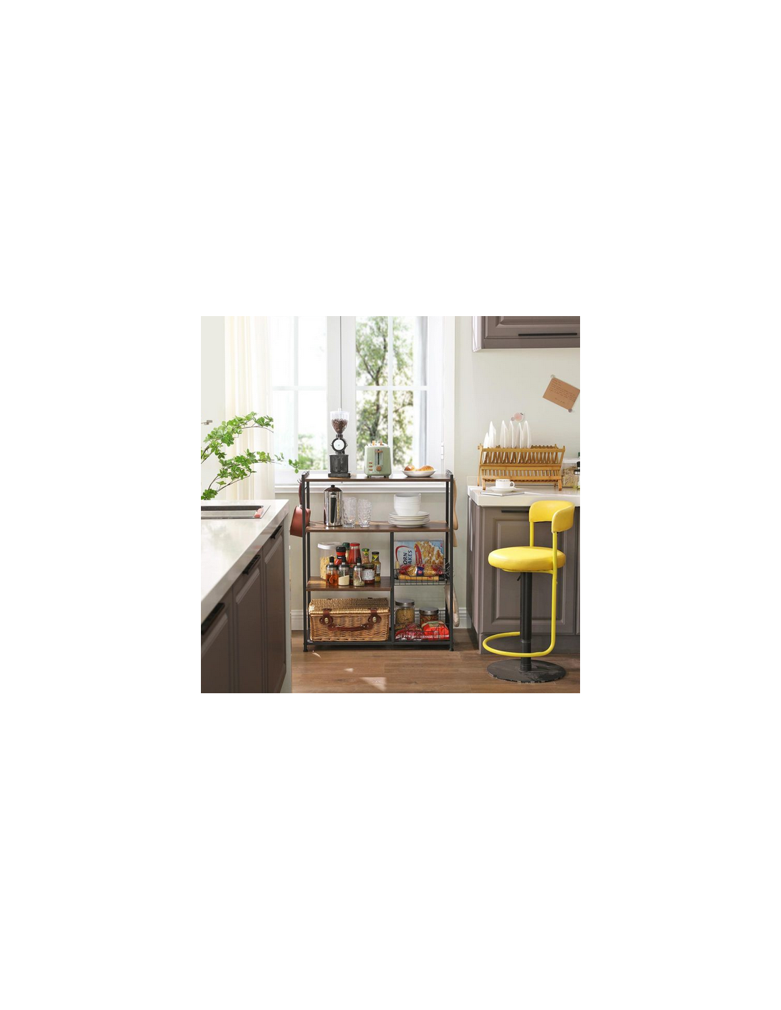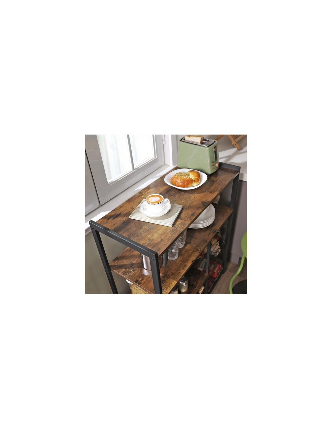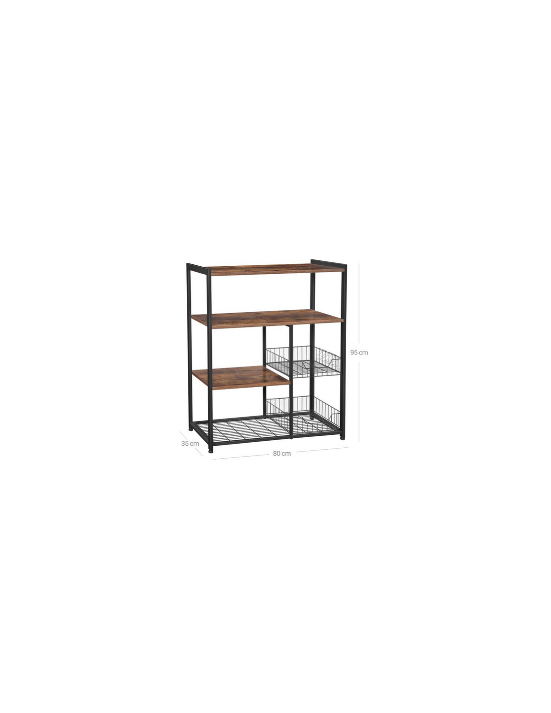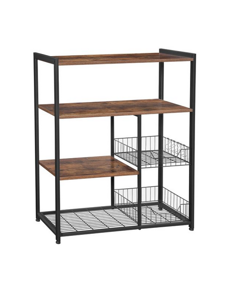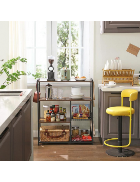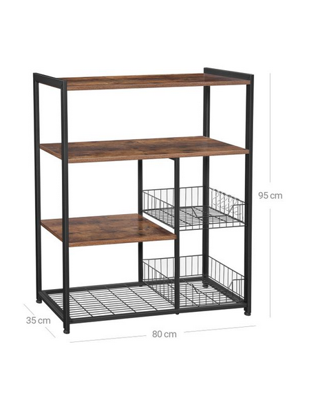 Køkkenreol udført i et design af sortlakeret metal og brun møbelplade. Reolen måler 95 cm i højden og 80 x 35 cm i bredde og dybde.