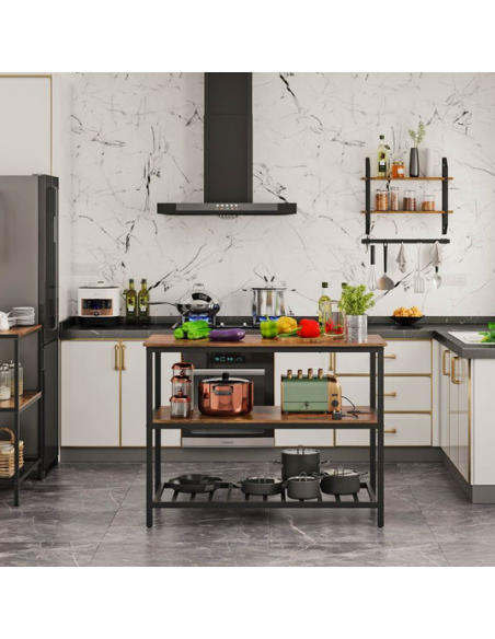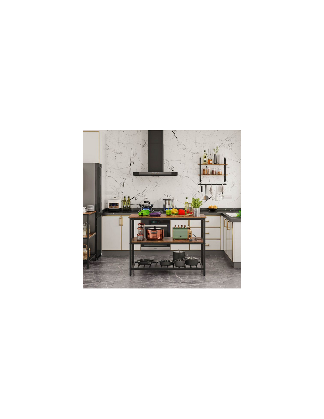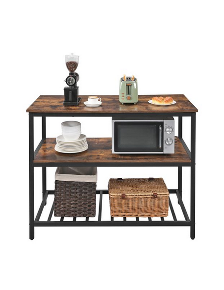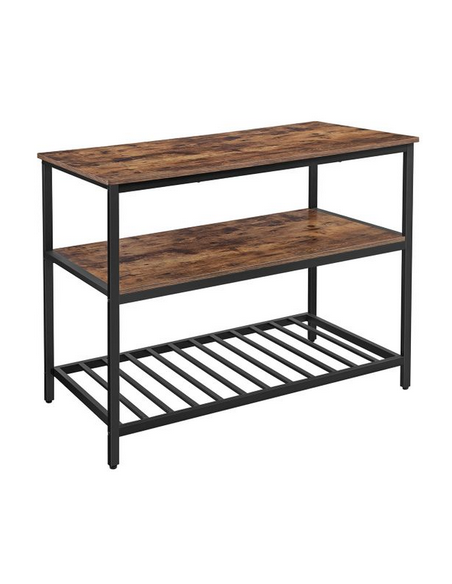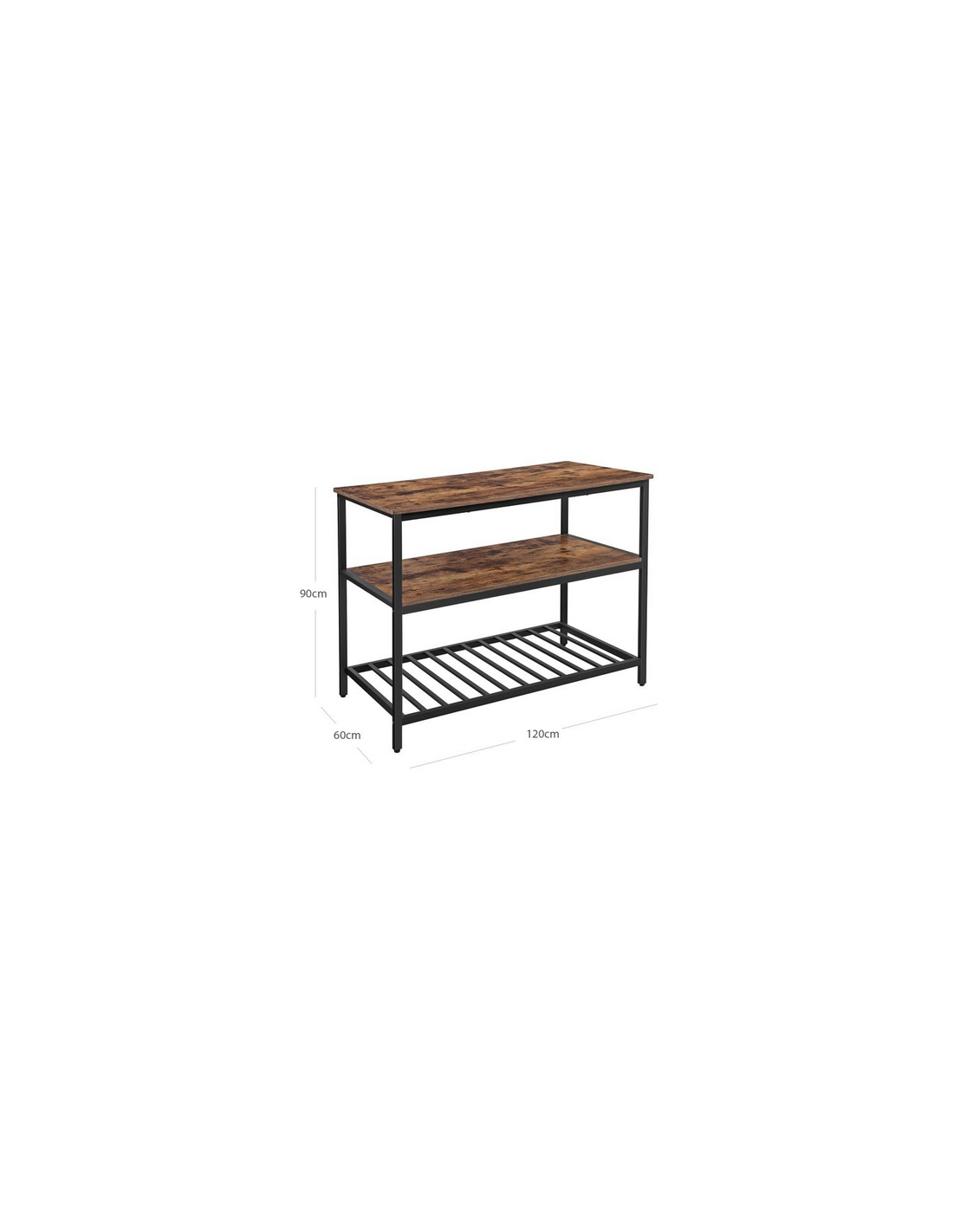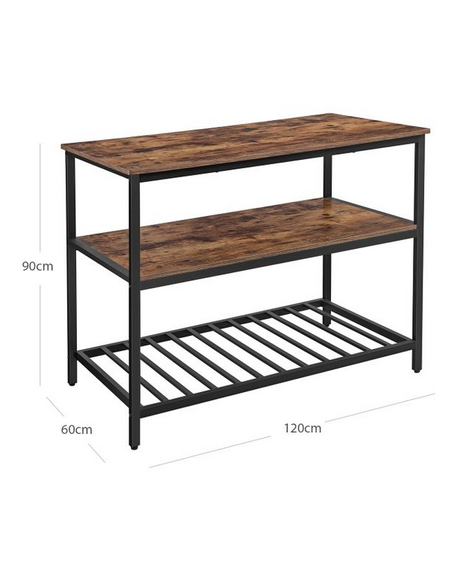 Køkkenø udført i et design af sortlakeret metal og brun møbelplade. Øen måler 90 cm i højden og 120 x 60 cm i bredde og dybde.