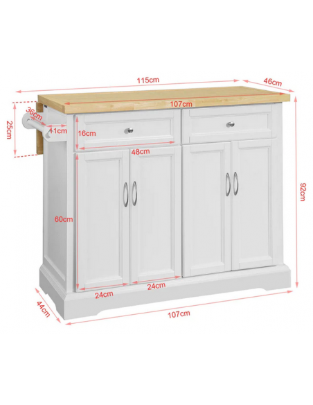 Køkkenskab eller serveringsvogn udført i et design af møbelplade og finér. Køkkenskabet måler 92 cm i højden og 115 x 46 cm i bredde og dybde. Køkkenskabet indeholder 2 skuffer samt 2 dobbeltskabe, hvert med 2 hylderum.