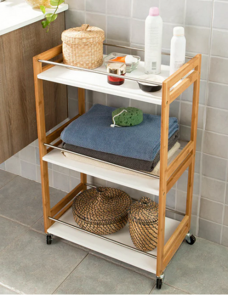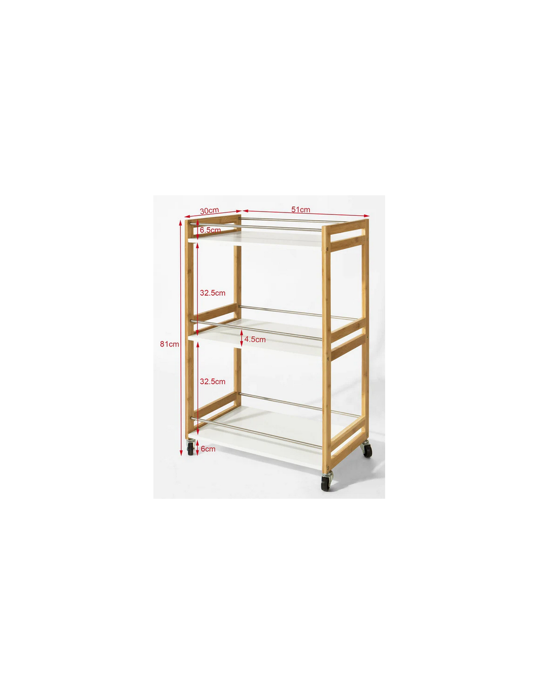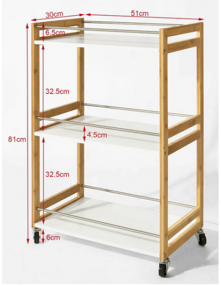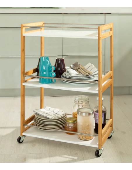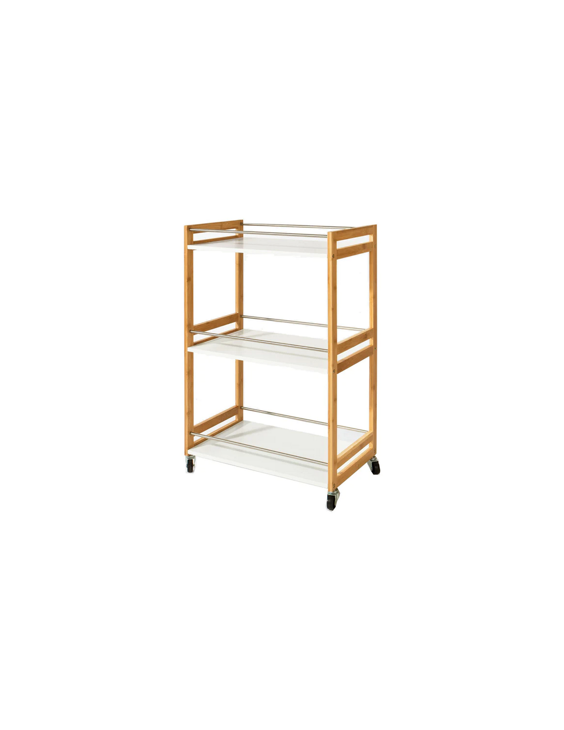 Serveringsvogn udført i et design af møbelplade og bambus. Serveringsvognen måler 81 cm i højden og 51 x 30 cm i bredde og dybde.