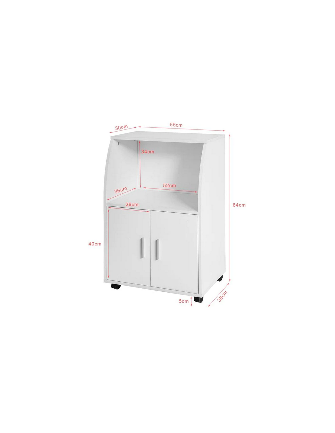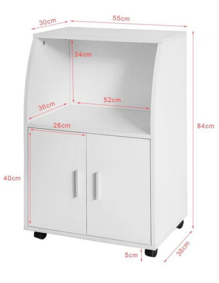 Mikrobølgeovn skab udført i et design af møbelplade. Skabet måler 84 cm i højden og 55 x 38 cm i bredde og dybde.