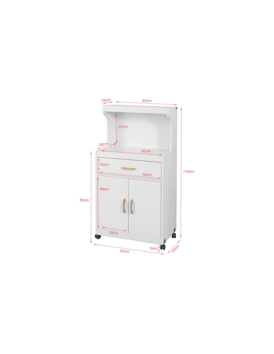 Mikrobølgeovn skab udført i et design af møbelplade. Skabet måler 119 cm i højden og 62 x 40 cm i bredde og dybde.