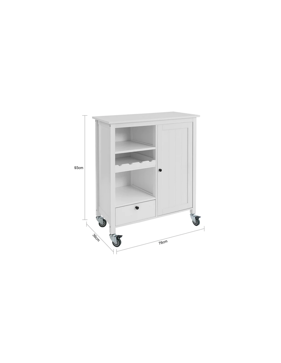 Køkkenskab eller serveringsvogn udført i et design af mdf. Serveringsvognen måler 93 cm i højden og 76 x 36 cm i bredde og dybde.