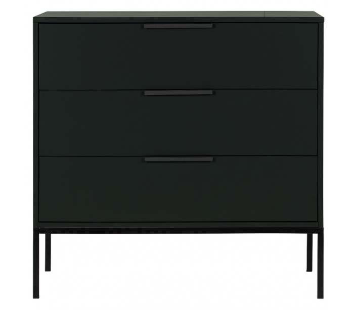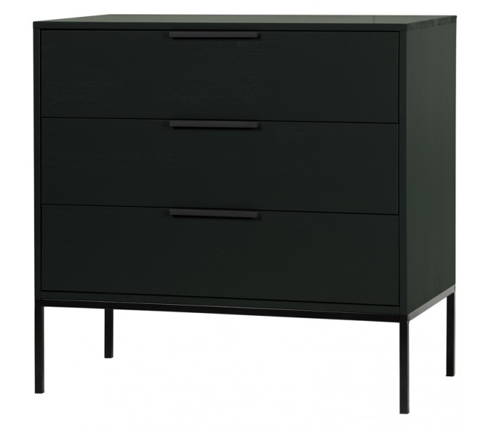 Kommode i et moderne design, fremstillet i sortlakeret fyrretræ og med stel i sortlakeret stål. Kommoden indeholder 3 skuffer og måler 93 cm i højden og 94 x 52 cm i bredde og dybde. Skufferne har indermåler (H16 cm x D42 cm). Selve skuffefronterne måler (H21,4 x B90 cm).