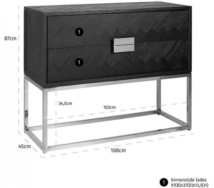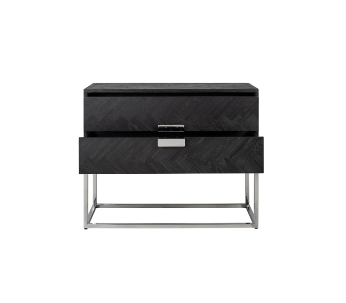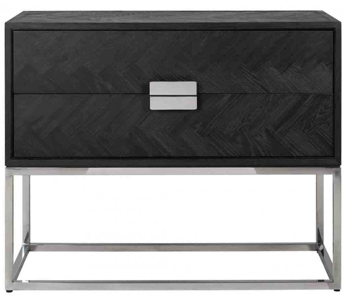 Kommode udført i et smukt og stilrent design, fra hollandske Richmond Interiors. Kommoden er fremstillet i sølvfarvet rustfri stål og sortlakeret egetræ, og kommer med 2 skuffer. Kommoden måler 87 cm i højden og 108 x 45 cm i bredde og dybde.