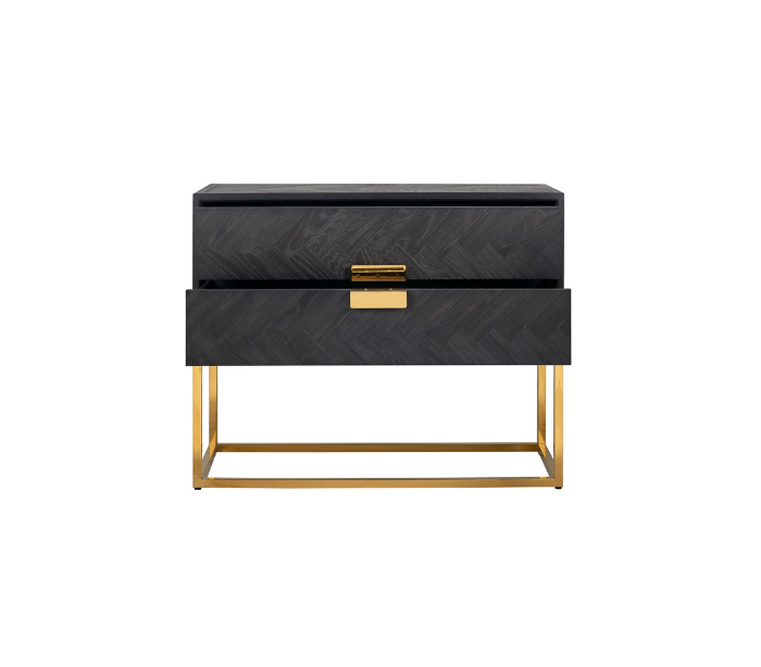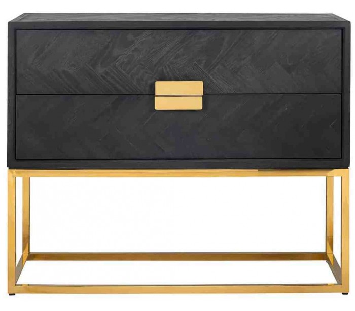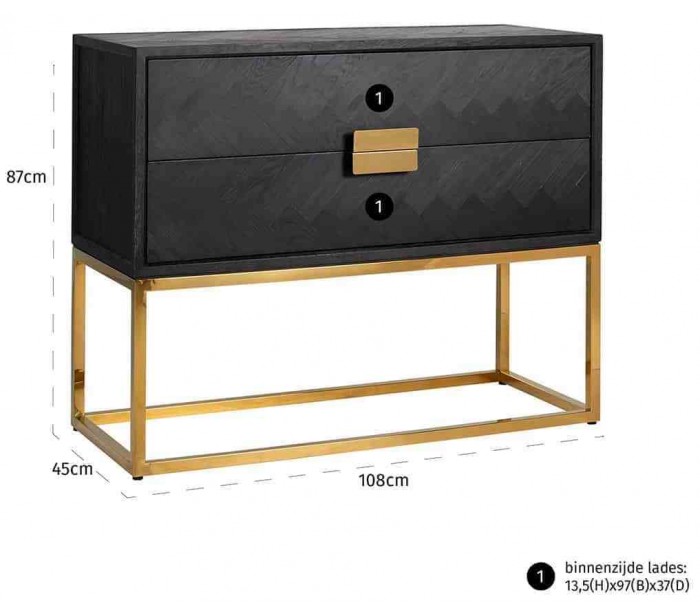 Kommode udført i et smukt og stilrent design, fra hollandske Richmond Interiors. Kommoden er fremstillet i guldfarvet rustfri stål og sortlakeret egetræ, og kommer med 2 skuffer. Kommoden måler 87 cm i højden og 108 x 45 cm i bredde og dybde.