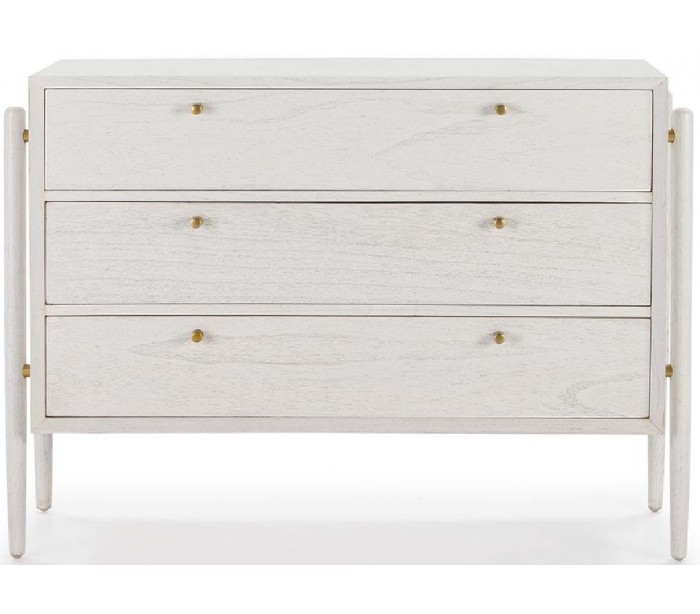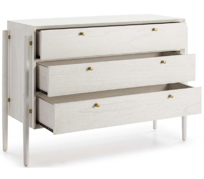 Kommode udført i et design af antik hvidbejset træ. Grebene er udført i antik guldfarvet metal. Kommoden kommer med 3 skuffer og måler 125 cm i bredden og 90 cm i højden.