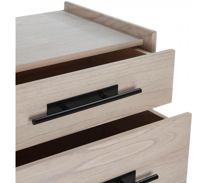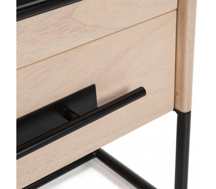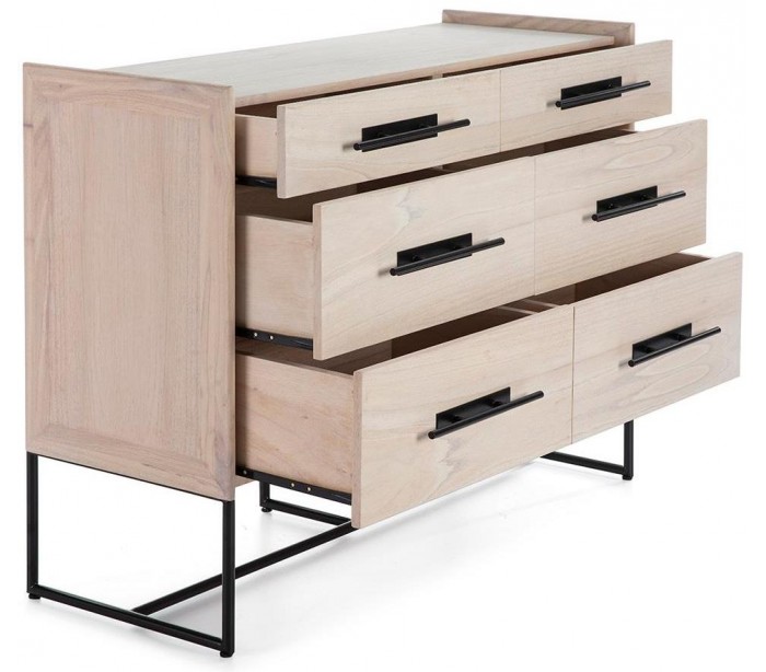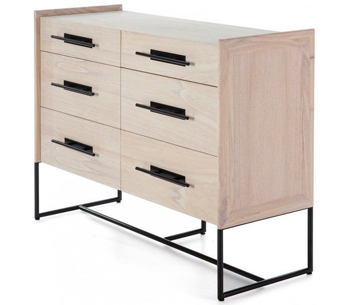 Kommode udført i et design af naturfarvet træ og med stel sortlakeret metal. Grebene er udført i sortlakeret metal. Kommoden kommer med 6 skuffer og måler 120 cm i bredden og 93 cm i højden.