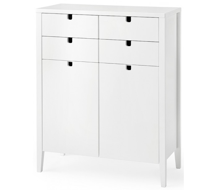 Kommode i et moderne design, fremstillet i hvidlakeret birketræ og mdf. Kommoden måler 73 x 36 cm i bredde og dybde og 91 cm i højden. I kommoden findes 4 skuffer samt 2 skabe, hvert med 1 flytbar hylde.