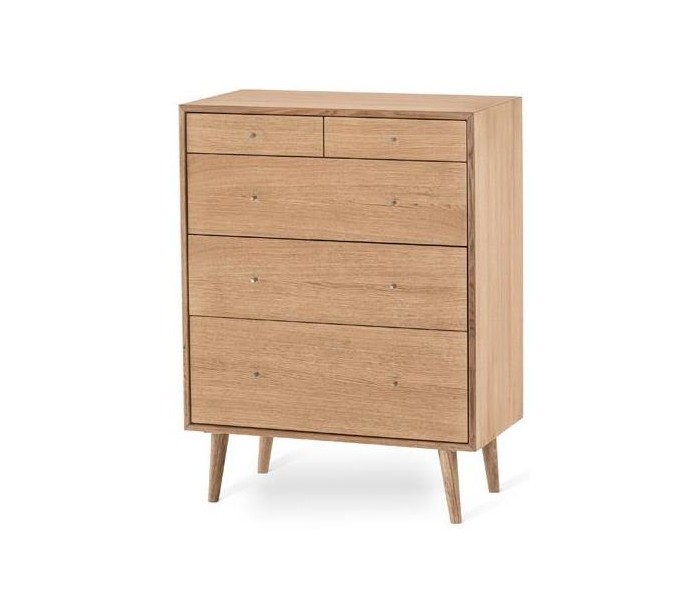 Kommode i et moderne design, fremstillet i olieret egetræ og egetræsfinér. Kommoden måler 72 x 39 cm i bredde og dybde og 95 cm i højden. I kommoden findes 5 skuffer.