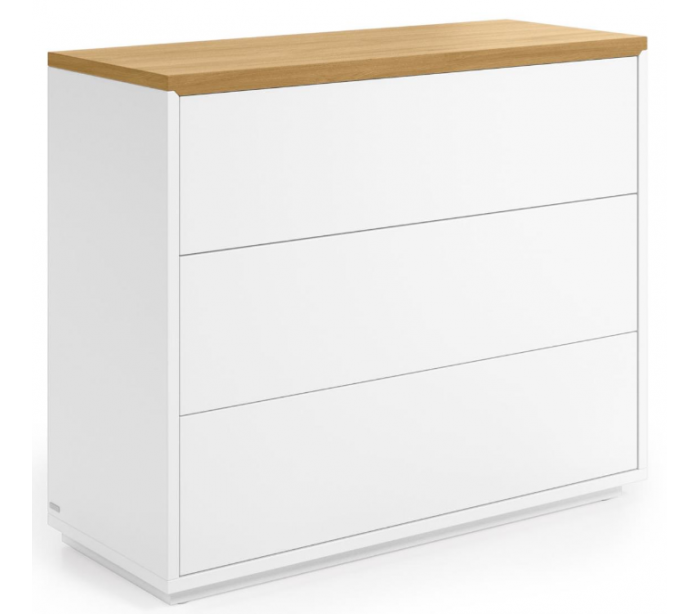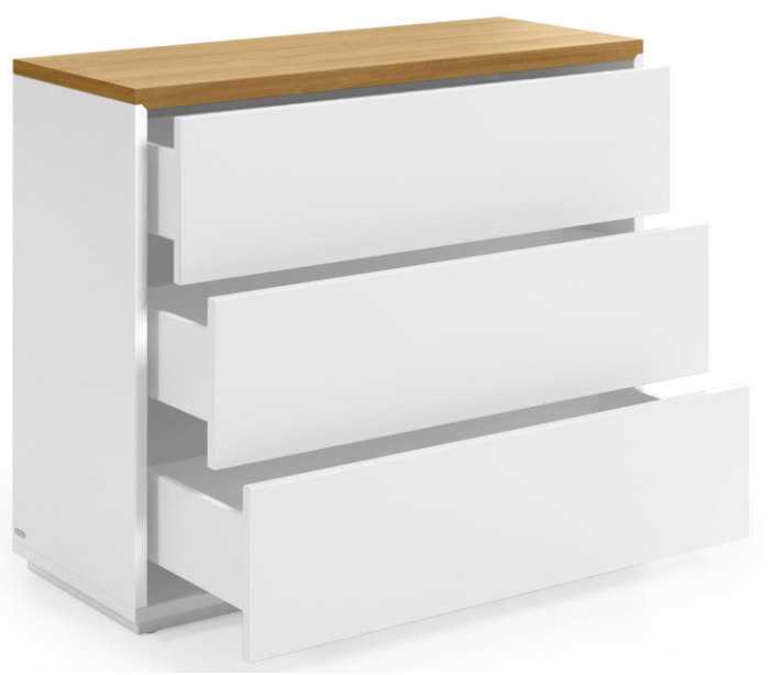 Kommode med 3 skuffer, udført i et moderne skandinavisk design fra LaForma. Kommoden er fremstillet i hvidfolieret mdf og naturfarvet egetræsfinér og måler 90 cm i bredden.