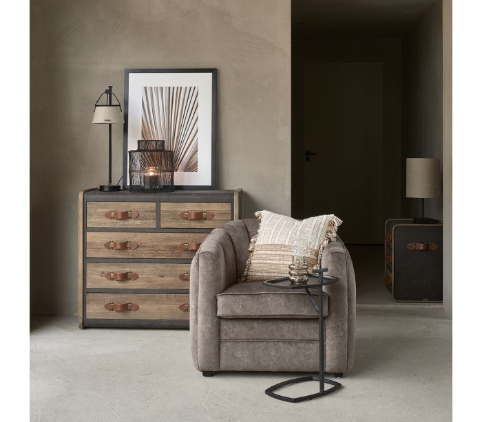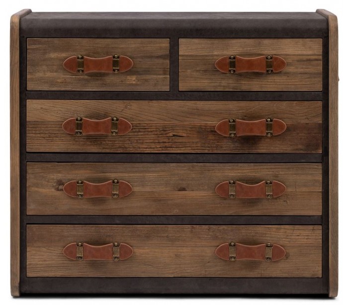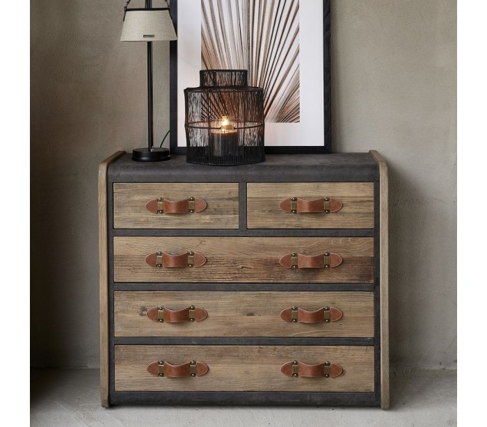 Riviera Maison kommode i et design af genanvendt egetræ og pellini læder. Kommoden indeholder i alt 5 skuffer og måler 95 cm i højden og 106 cm i bredden.