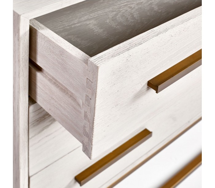 Kommode udført i et rustikt design i antik gråhvid bejset egetræ og antik guldfarvet metal. Kommoden er med 3 skuffer og måler 86 cm i højden og 100 cm i bredden.