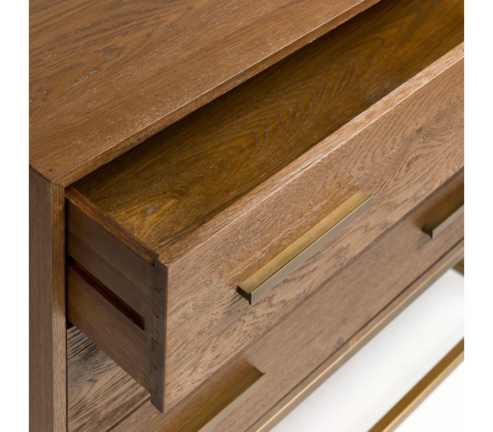 Kommode udført i et rustikt design i antik brunbejset egetræ og antik guldfarvet metal. Kommoden er med 3 skuffer og måler 86 cm i højden og 100 cm i bredden.