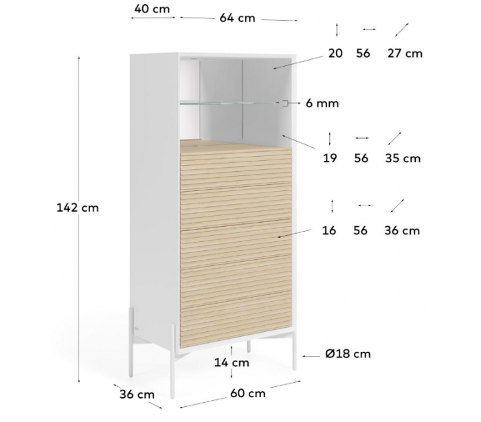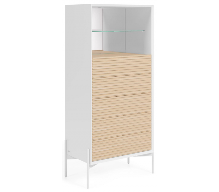 Kommode med 5 skuffer og 2 åbne hylderum, udført i et skandinavisk design fra LaForma. Kommoden er fremstillet i mdf og askfinér og måler 64 cm i bredden og 142 cm i højden.