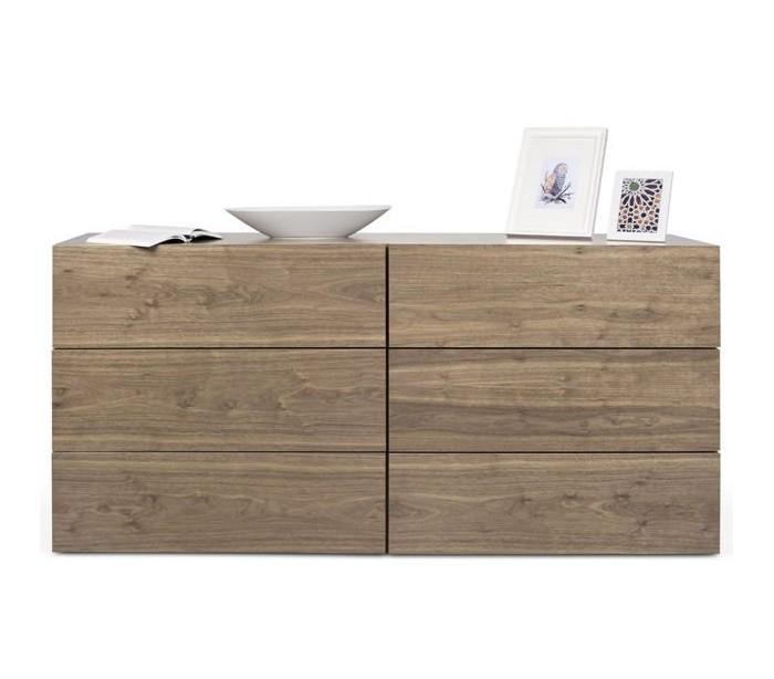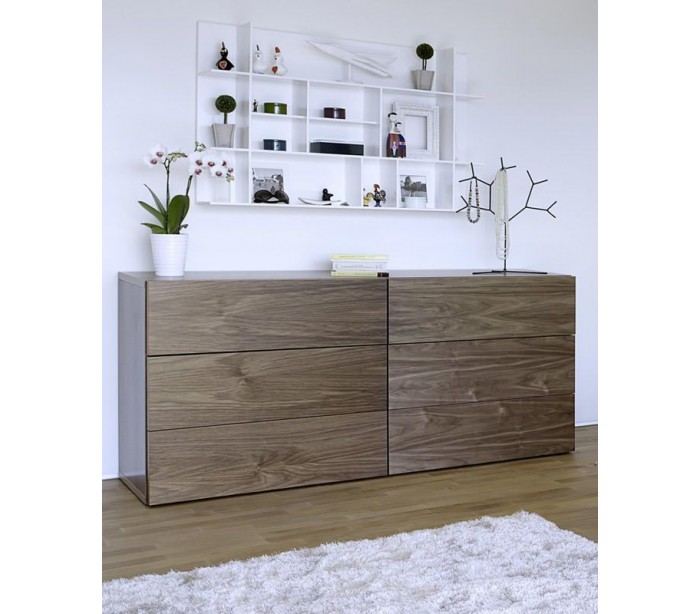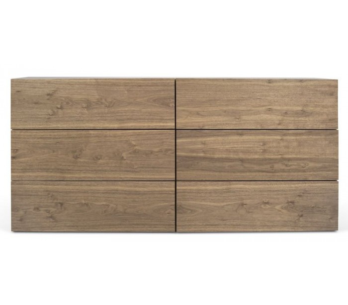 TemaHome Aurora kommode udført i et design af valnøddefinér. Kommoden måler 82 cm i højden og 180 x 53 cm i bredde og dybde. Kommoden indeholder 6 skuffer.