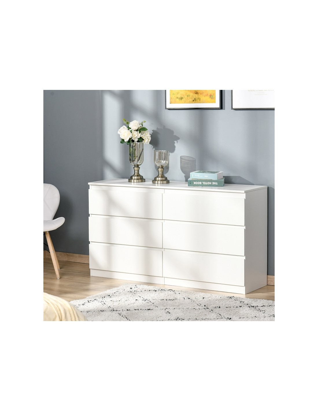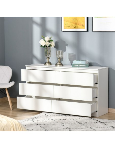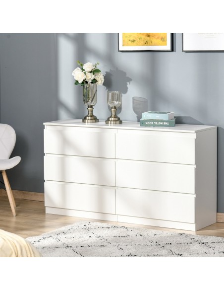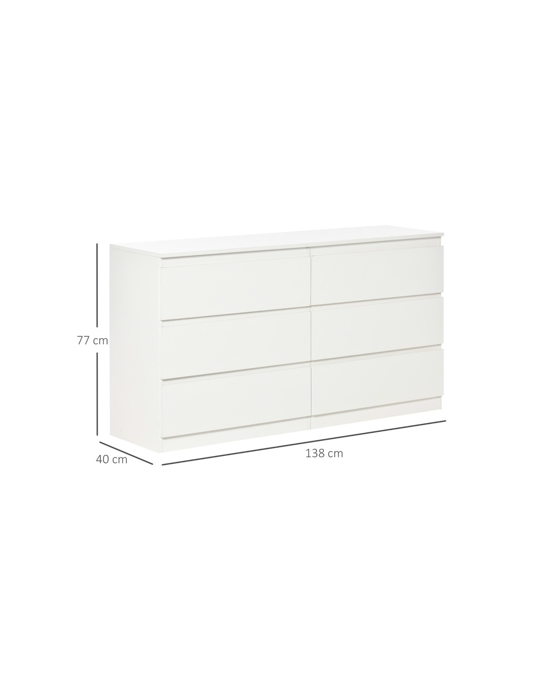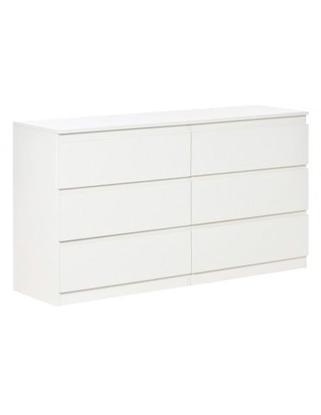 Kommode udført i et design af møbelplade. Kommoden indeholder 6 skuffer og måler 138 x 40 cm i bredde og dybde og 77 cm i højden.