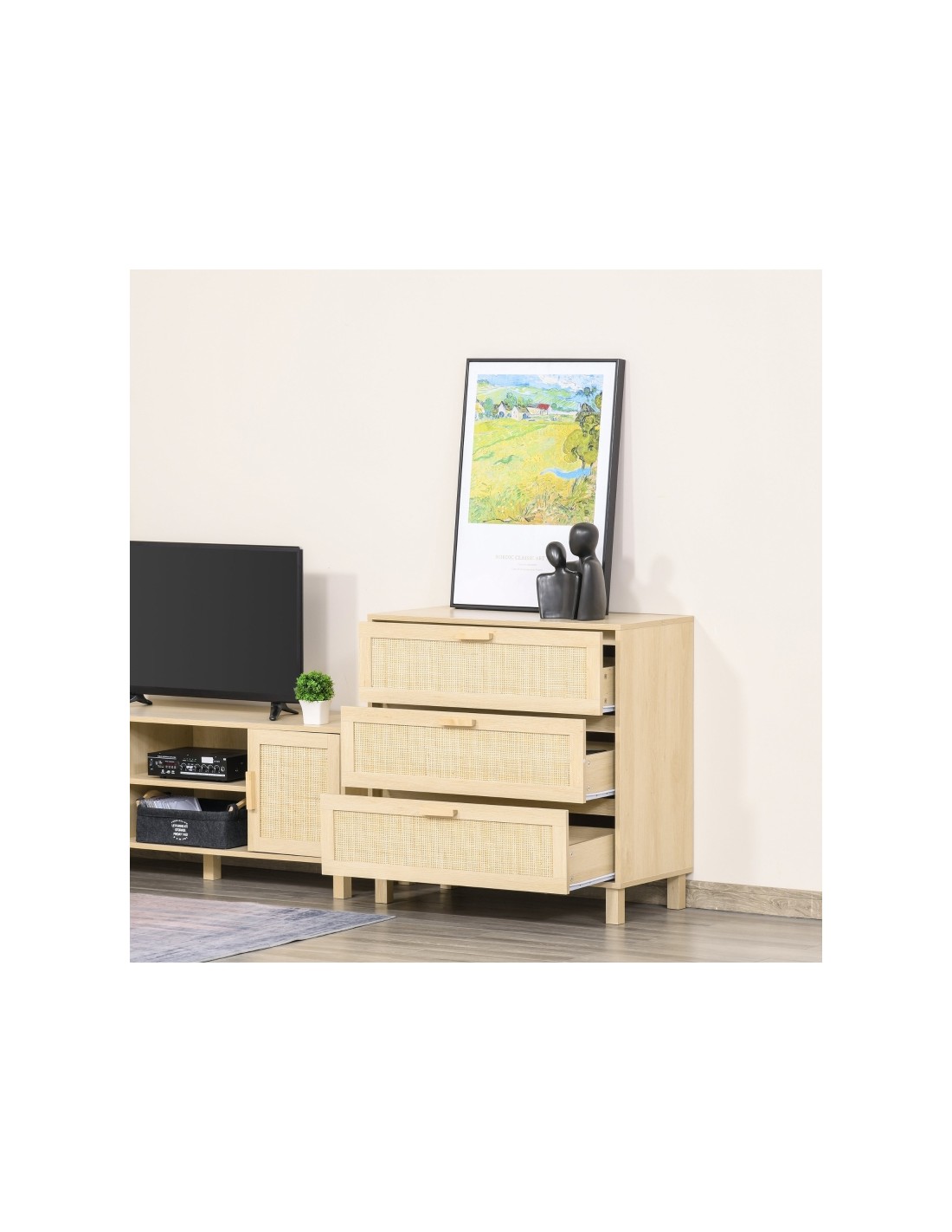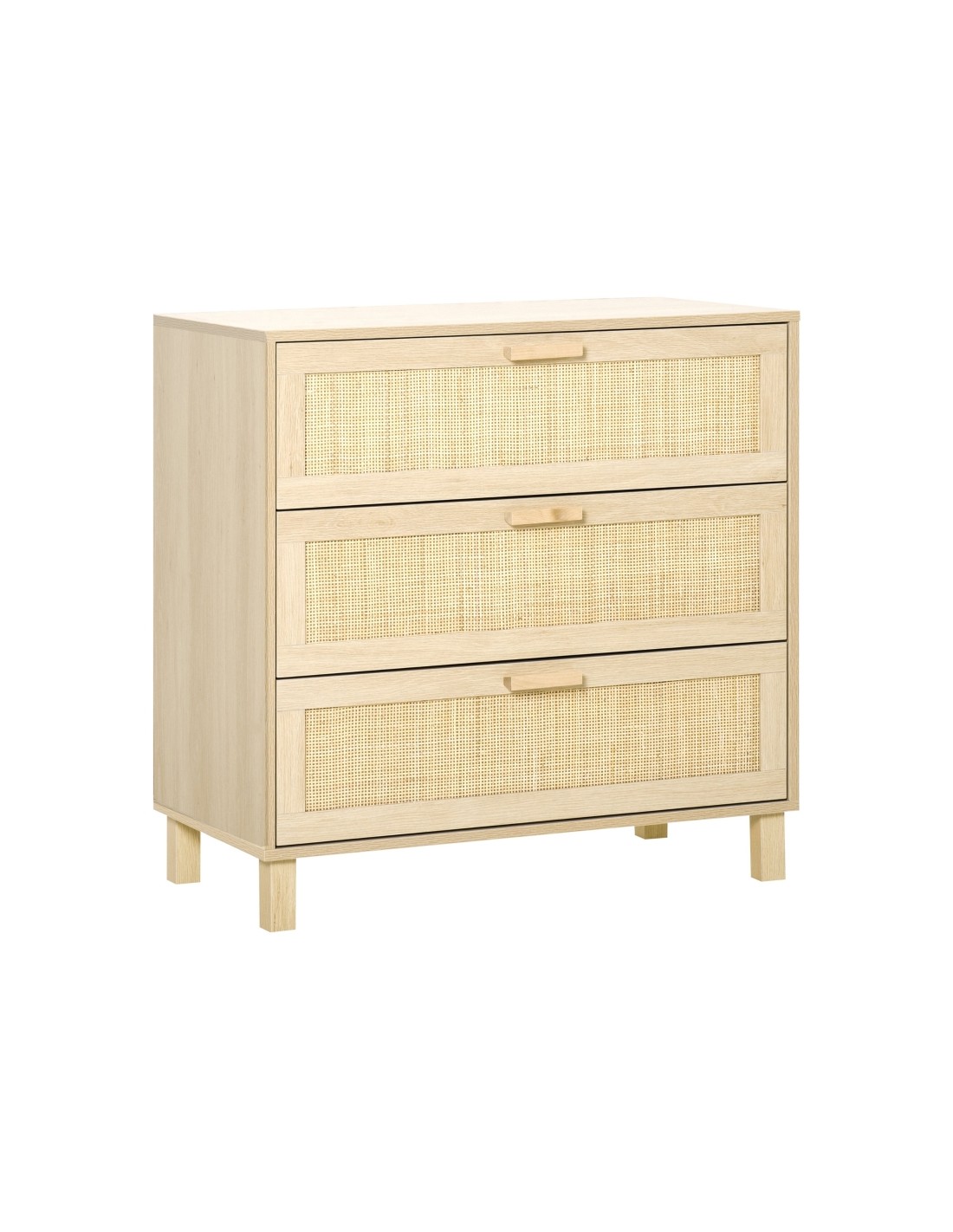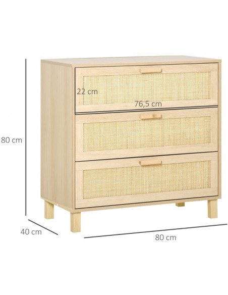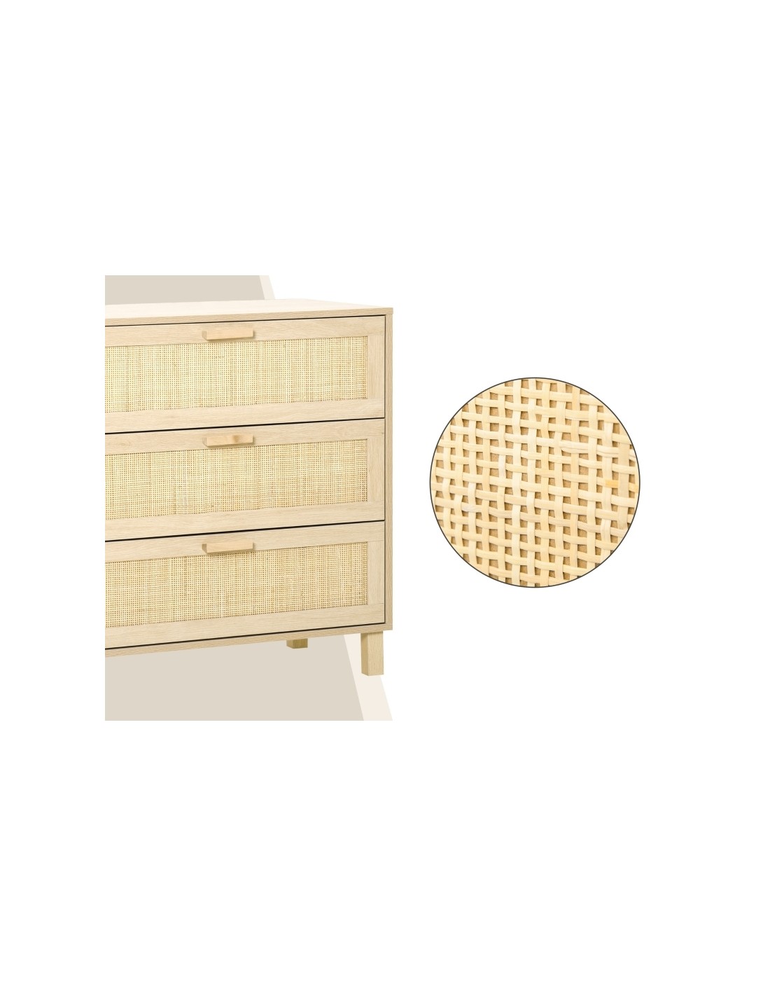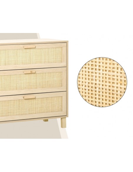 Kommode med 3 skuffer, udført i et design af MDF og rattan. Kommoden måler 80 x 40 cm i bredde og dybde og 80 cm i højden.