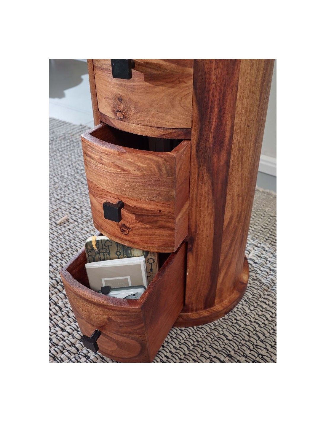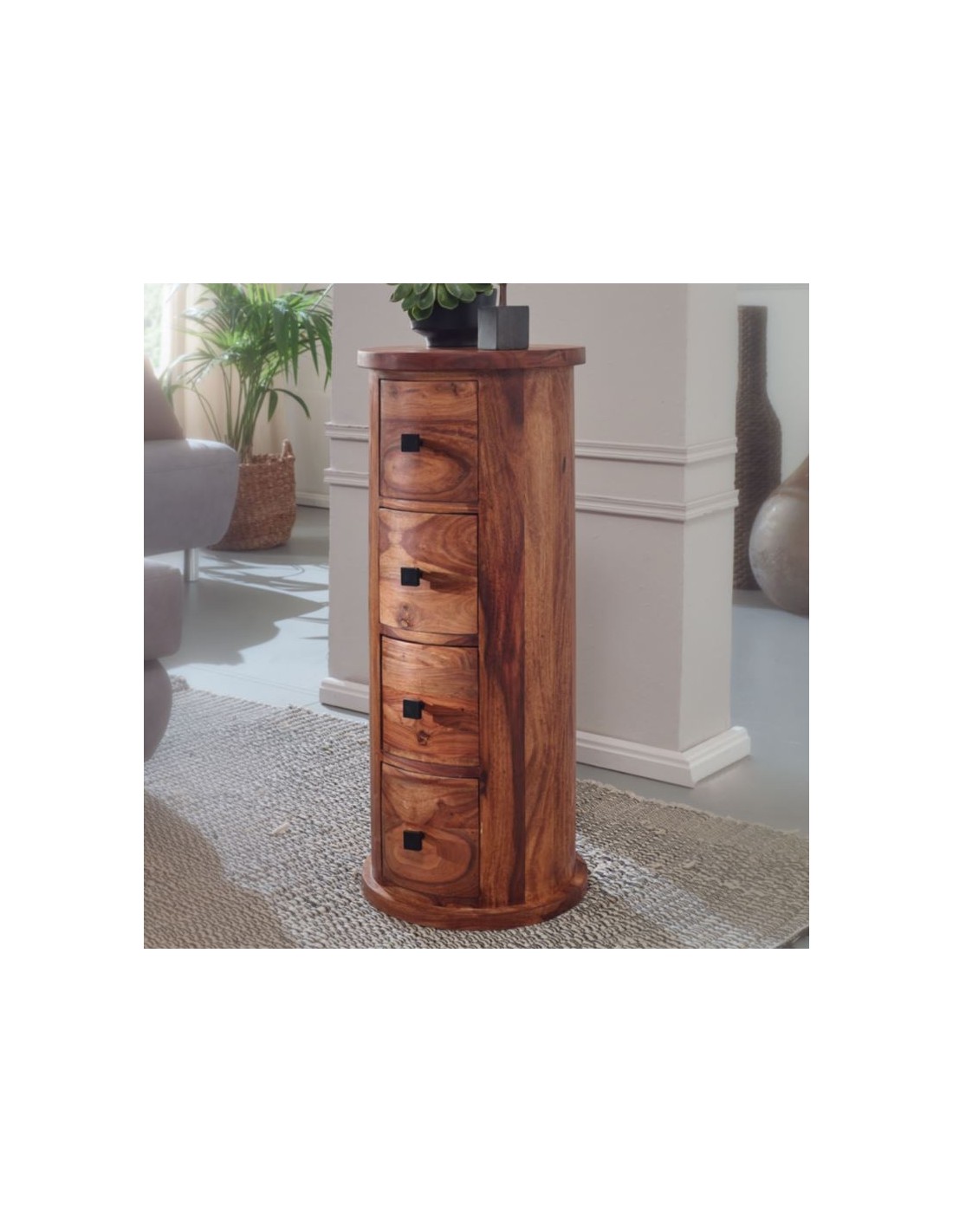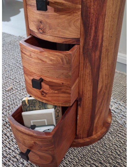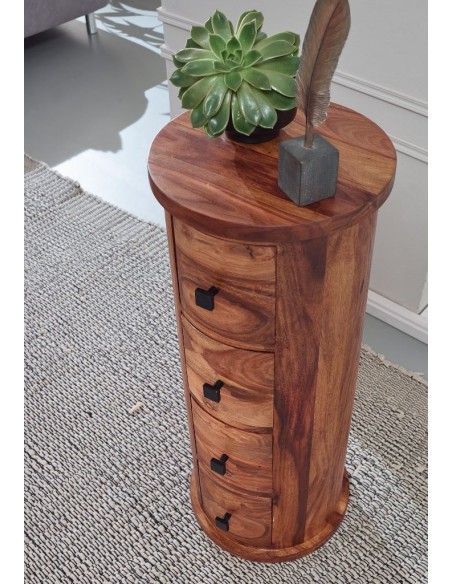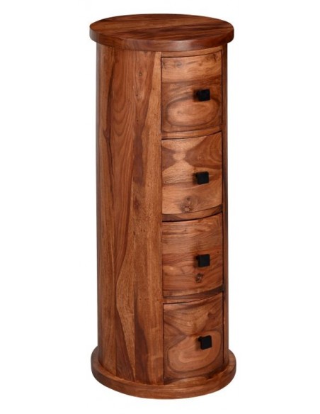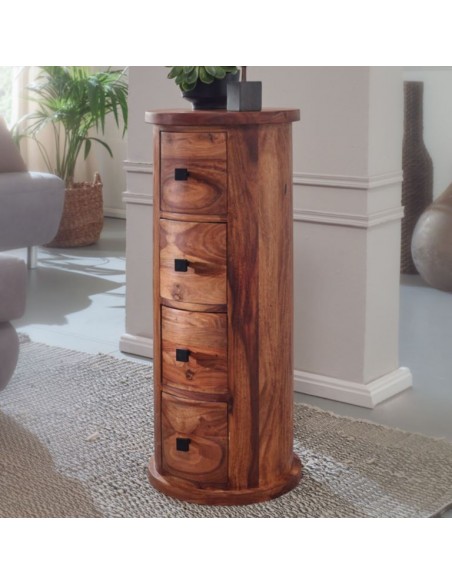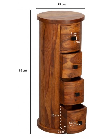 Kommode fremstillet i et design af brun sheeshamtræ. Kommoden måler 85 cm i højden og 35 cm i diameter.