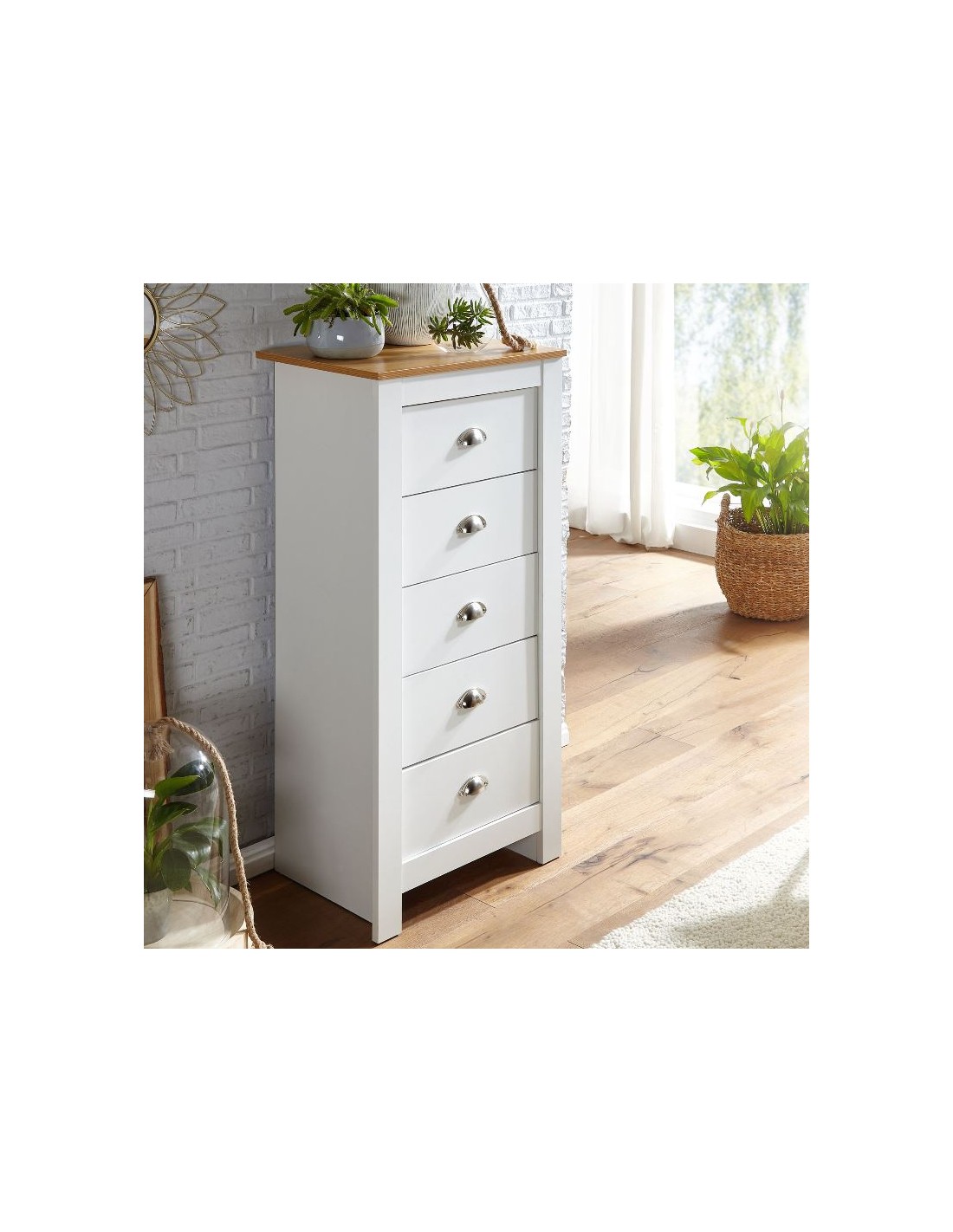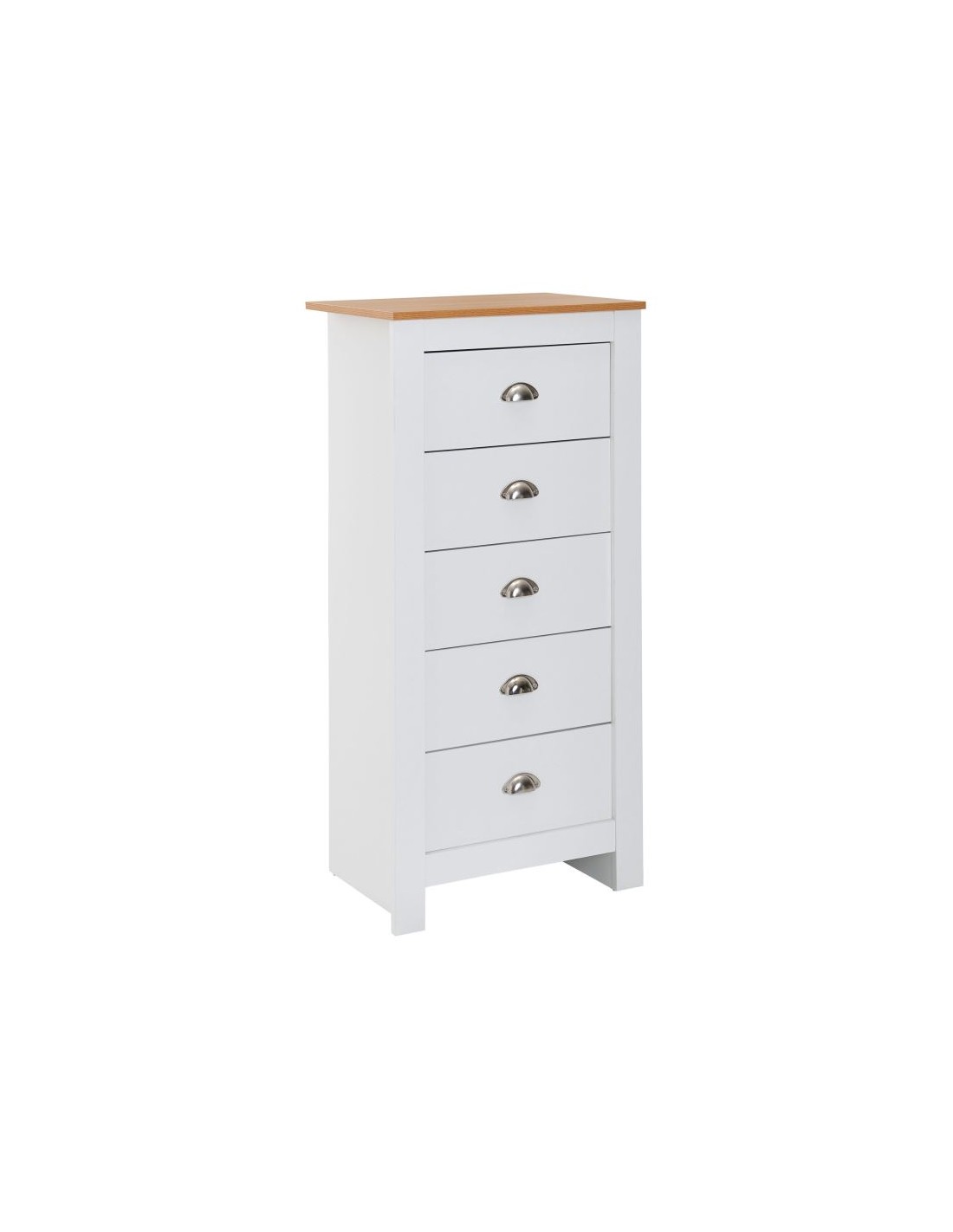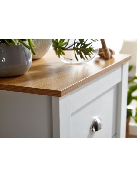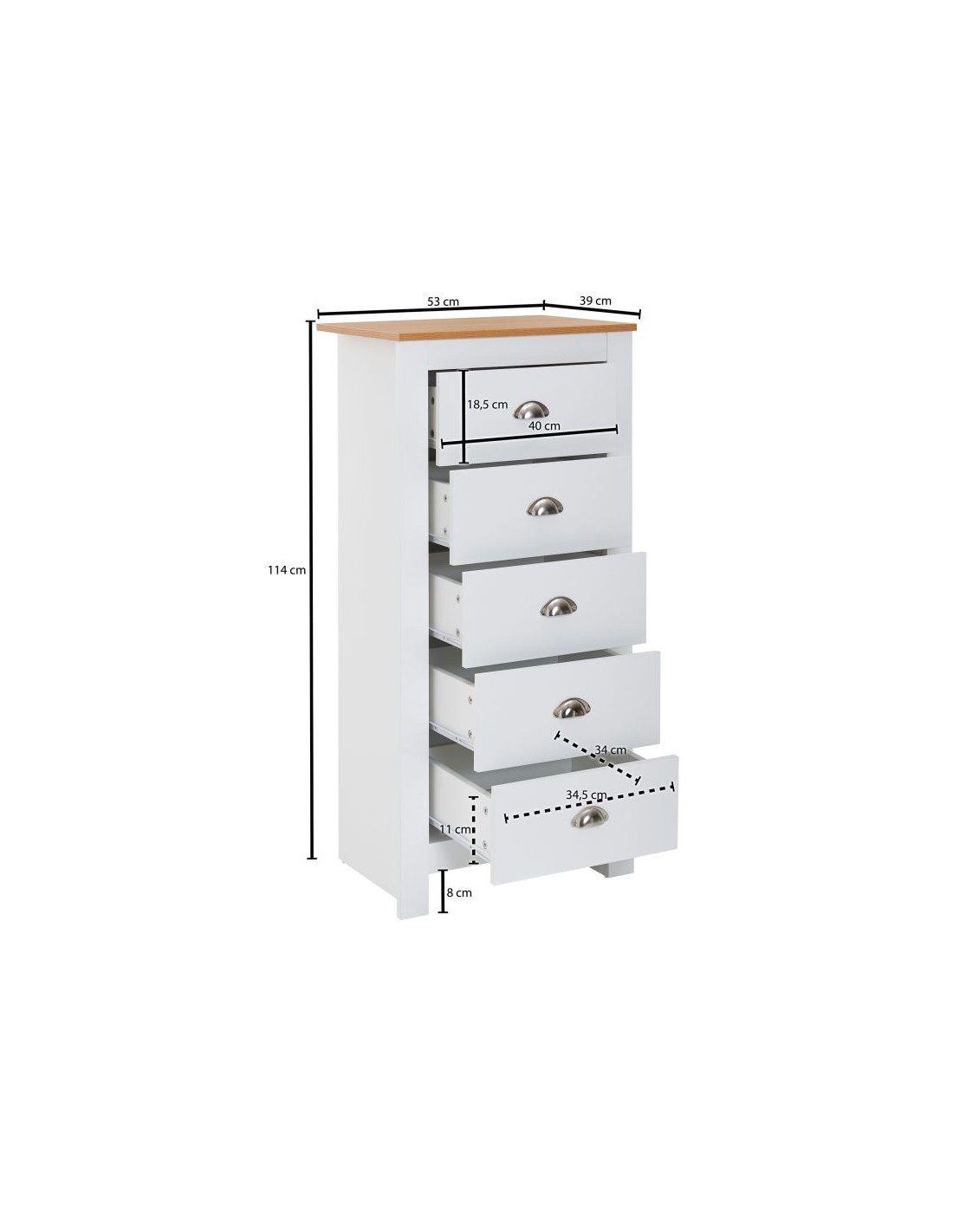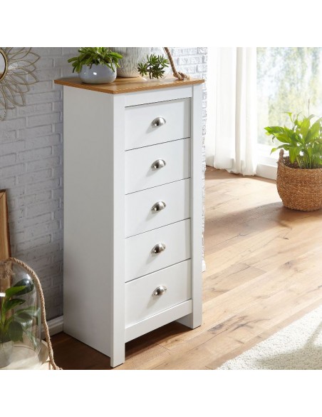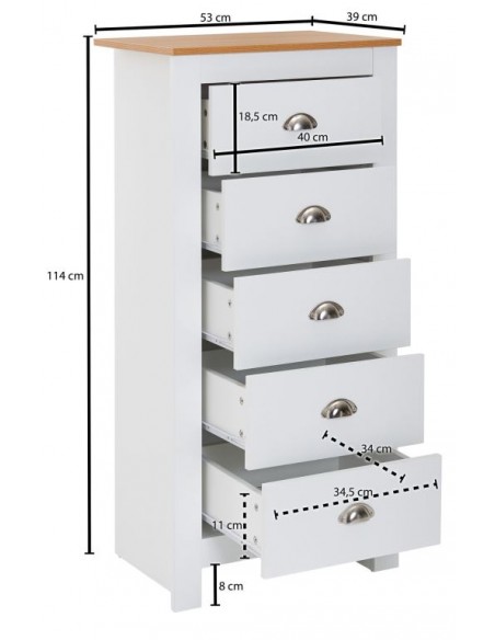Kommode fremstillet i et design af hvid og naturfarvet møbelplade. Kommoden måler 114 cm i højden og 53 x 39 cm i bredde og dybde.