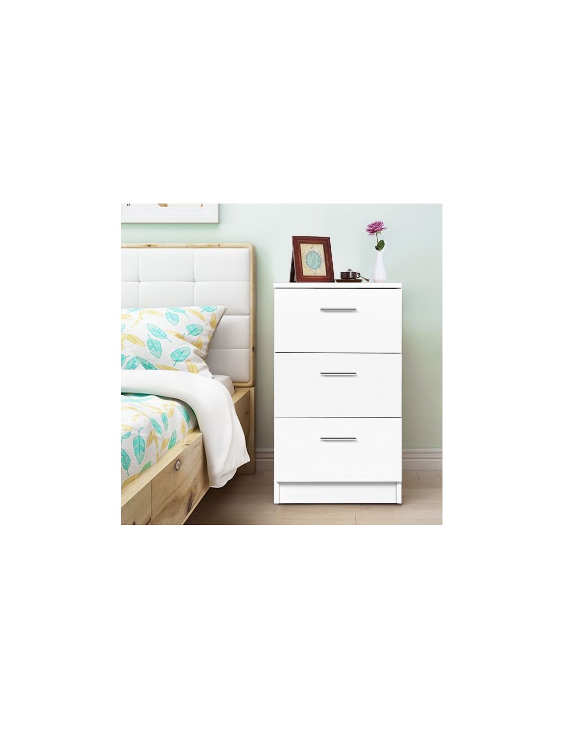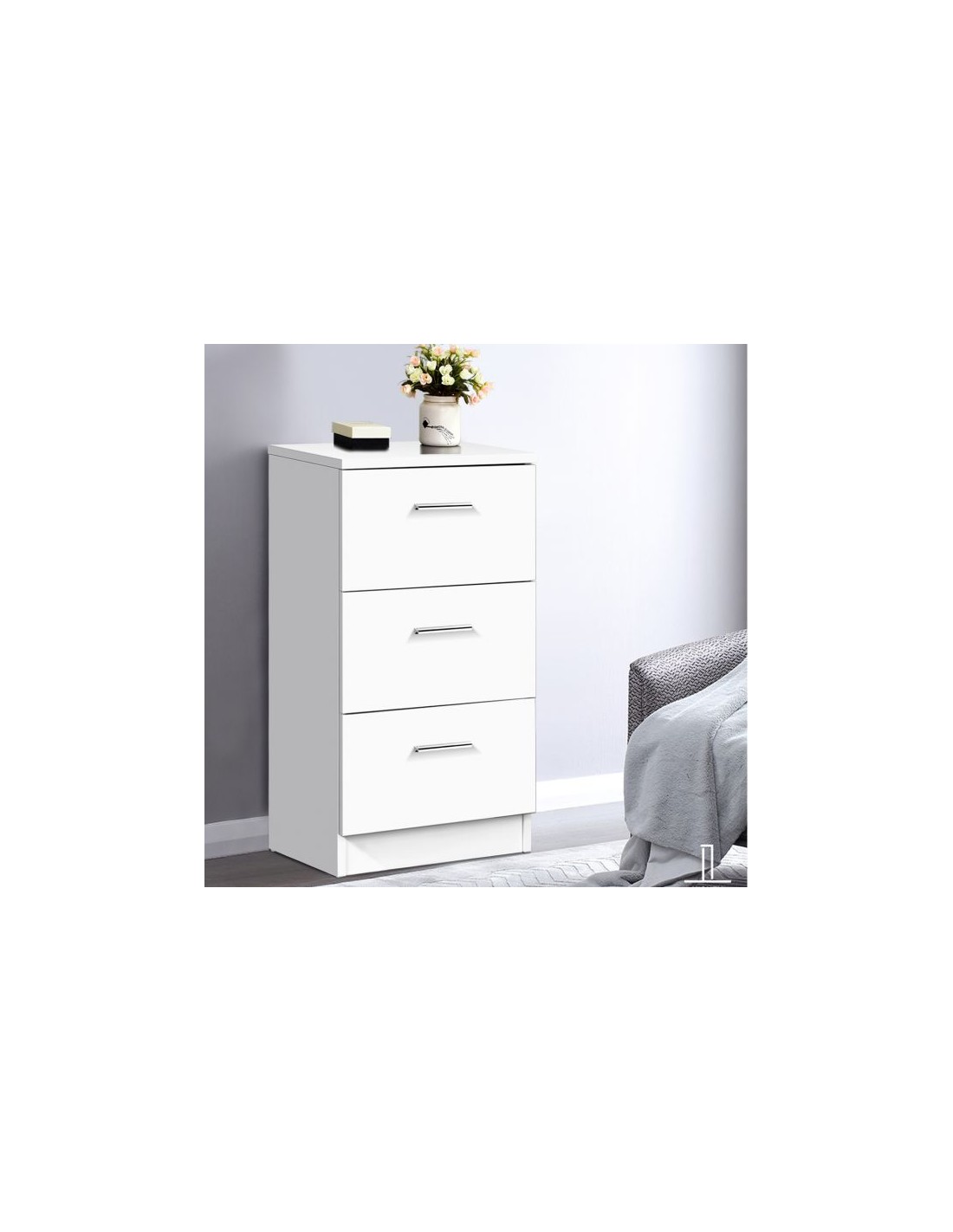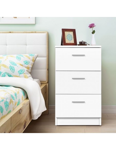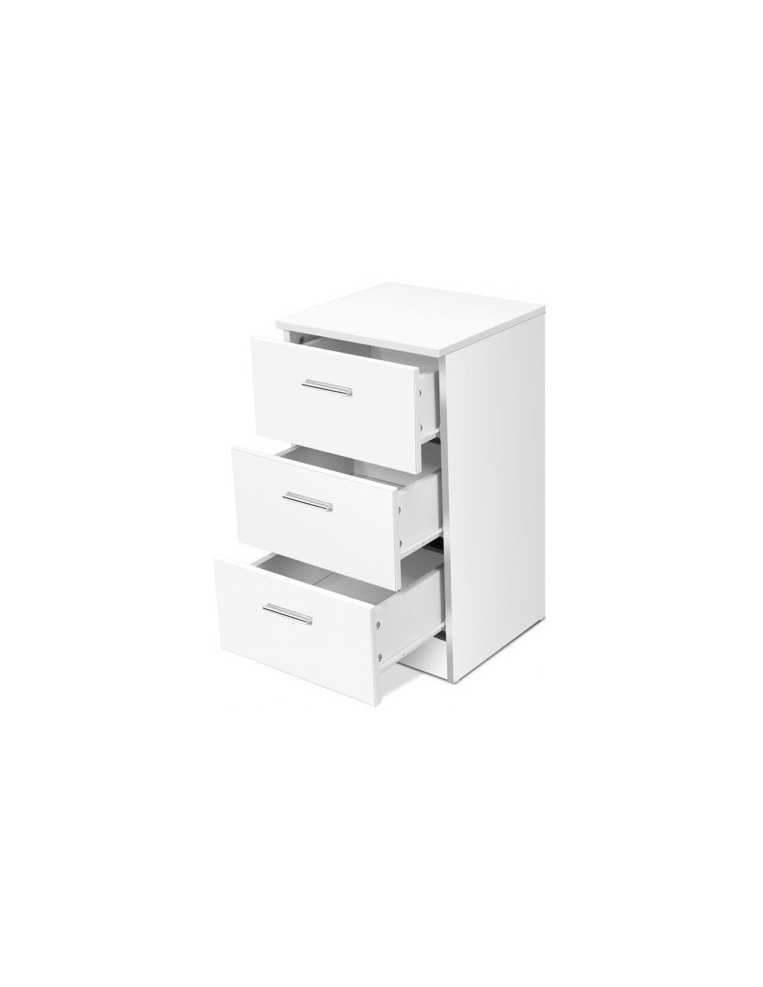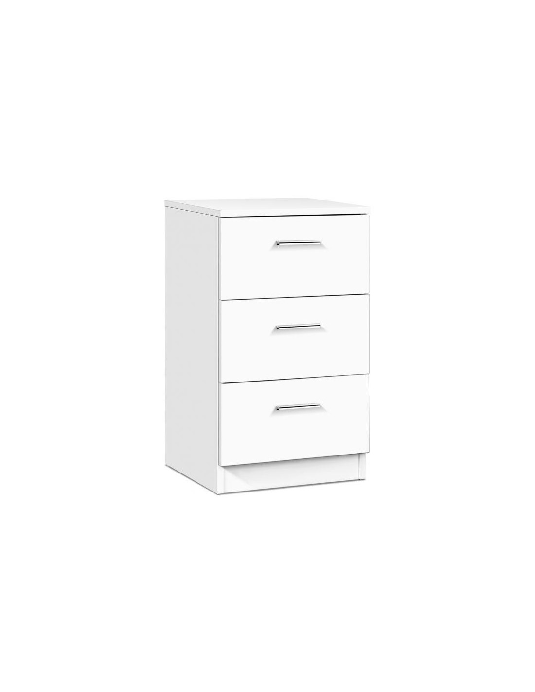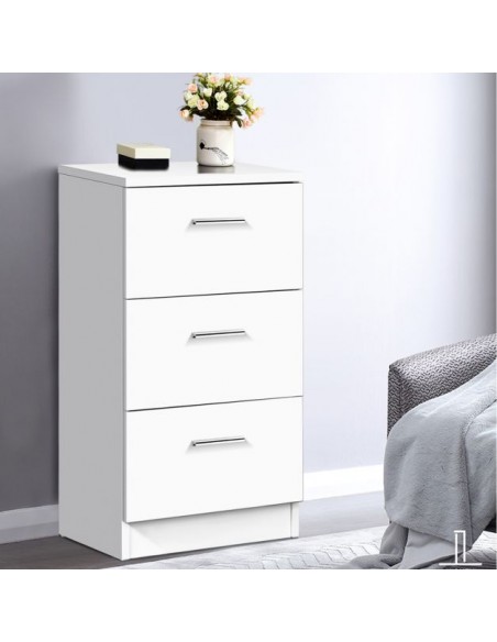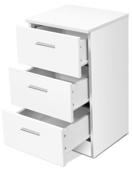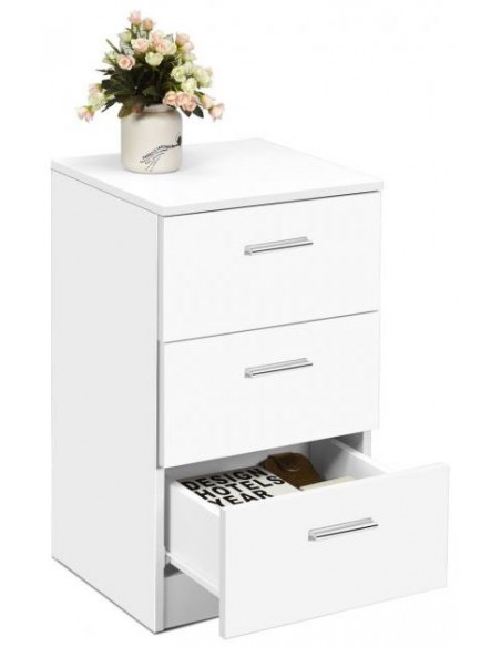 Kommode udført i et design af hvid møbelplade. Kommoden måler 67 cm i højden og 38 x 35 cm i bredde og dybde.