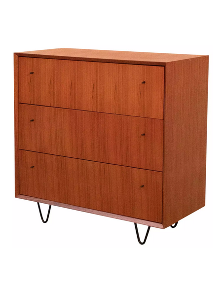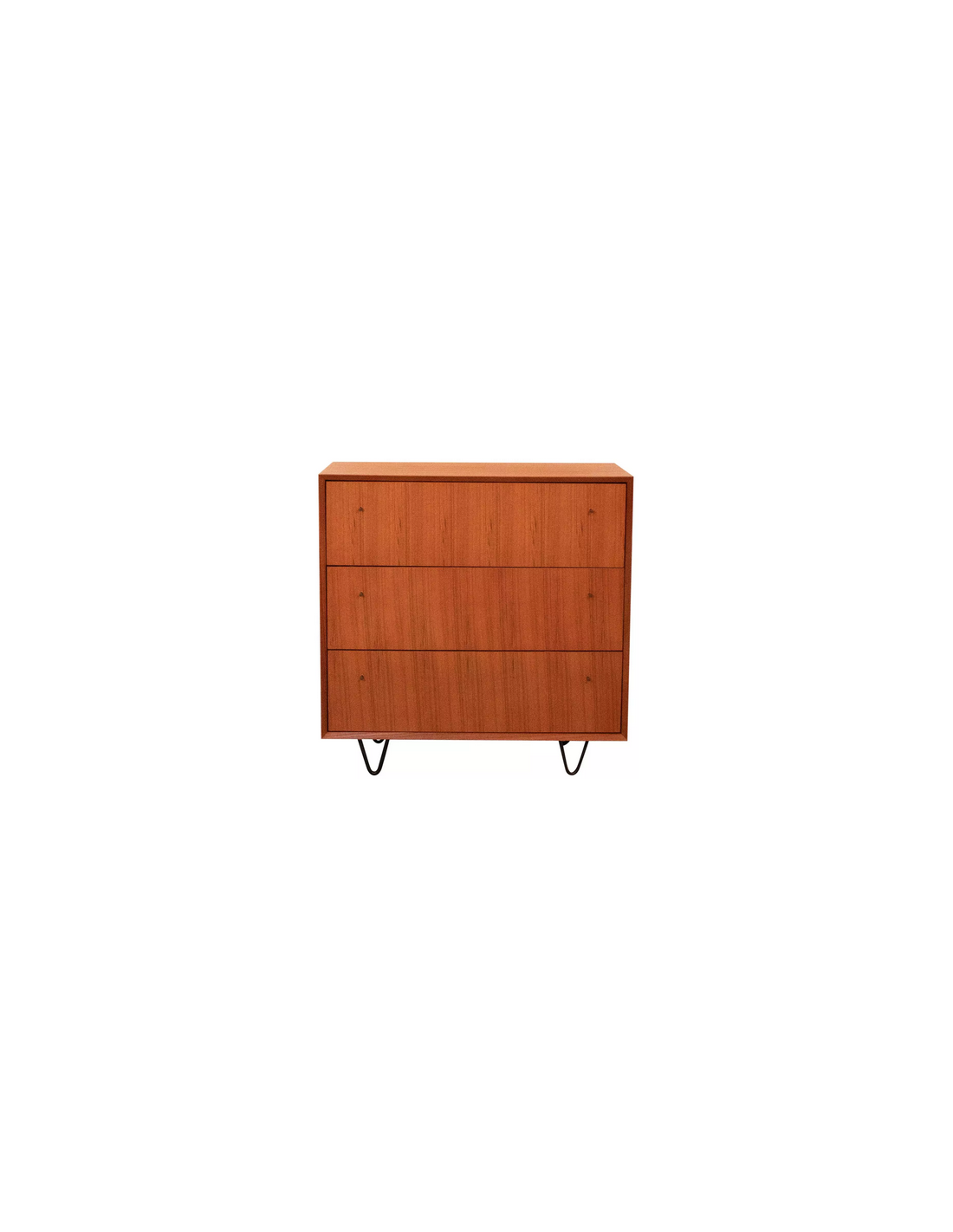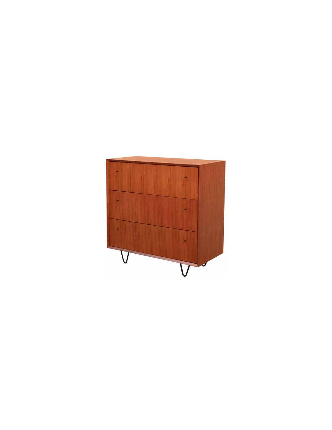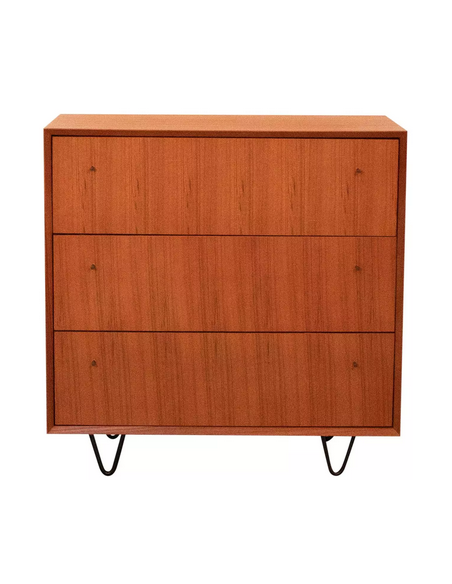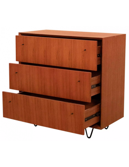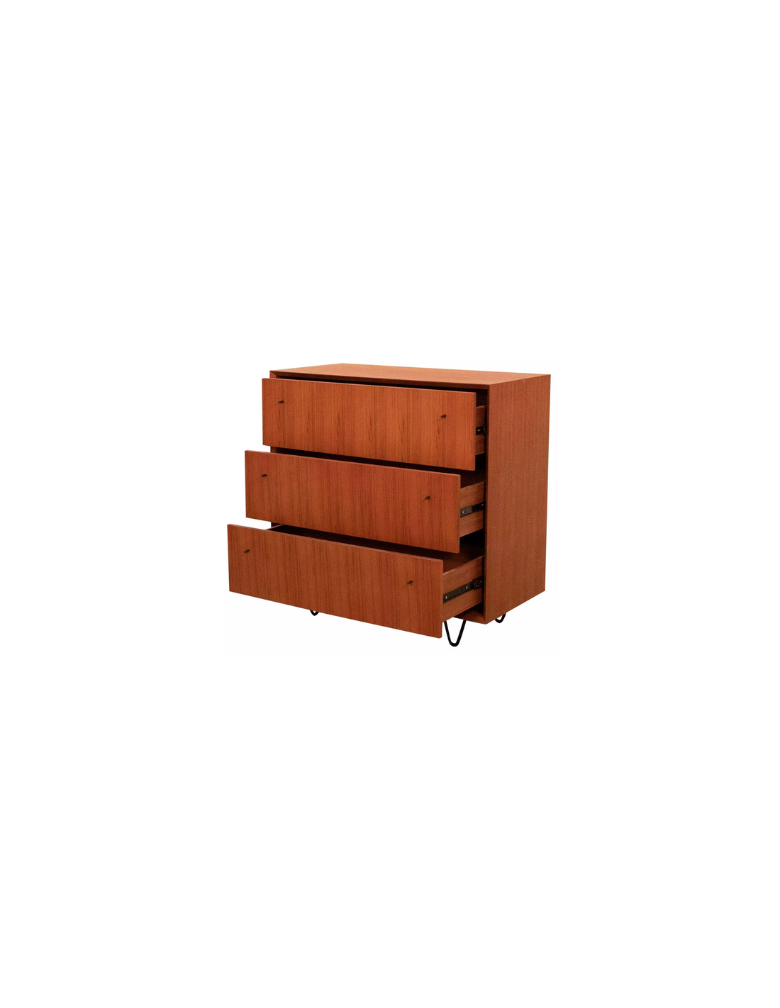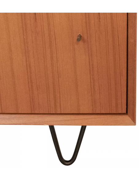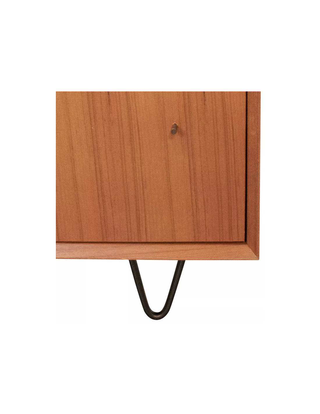 Kommode udført i et design af sortlakeret metal og teaktræsfinér. Kommoden måler 96 cm i højden og 90 x 46 cm i bredde og dybde.