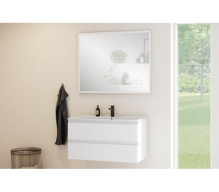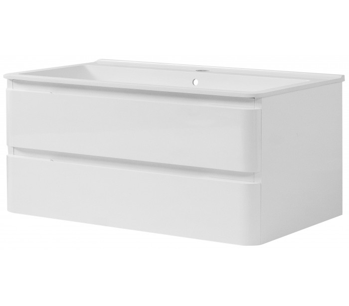 Miami komplet badmiljø med underskab og håndvask, udført i et design af mat hvid og hvid støbemarmor. Badmiljøet måler 90,5 cm i bredden, 50 cm i højden og 47,5 cm i dybden. Leveres med integreret greb med afrundede kanter samt 2 skuffer med softclose. Justérbare ophængsbeslag medfølger.