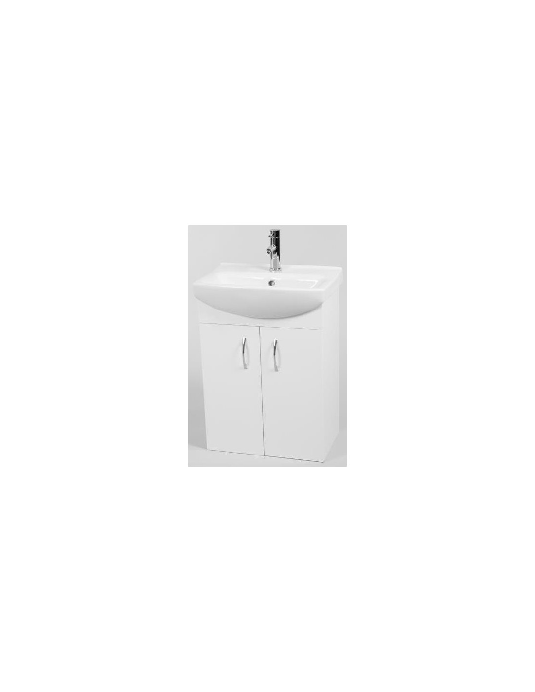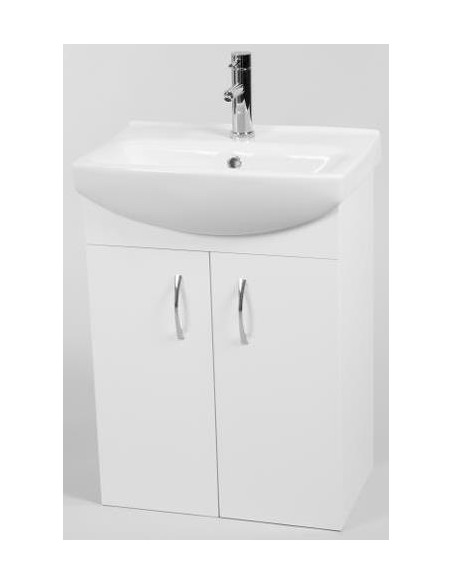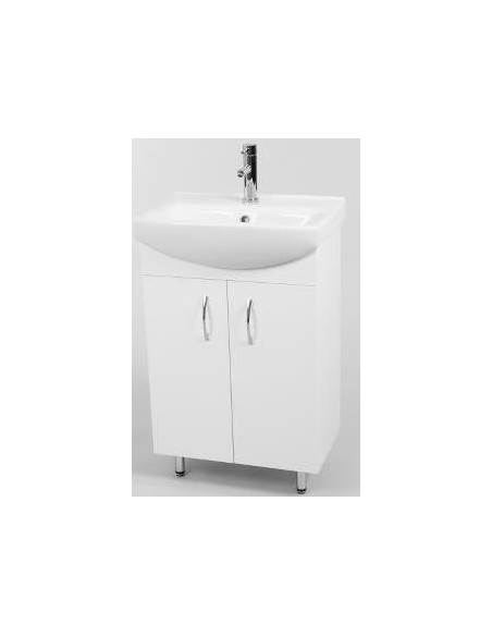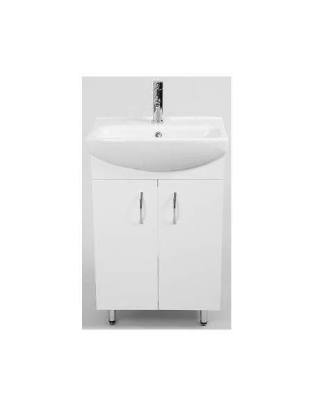 Kiev komplet badmiljø med underskab og håndvask, udført i et design af hvid højglans og hvid porcelæn. Badmiljøet måler 54,6 cm i bredden, 74 cm i højden og 38,5 cm i dybden. Bemærk venligst, at det viste armatur ikke medfølger.
