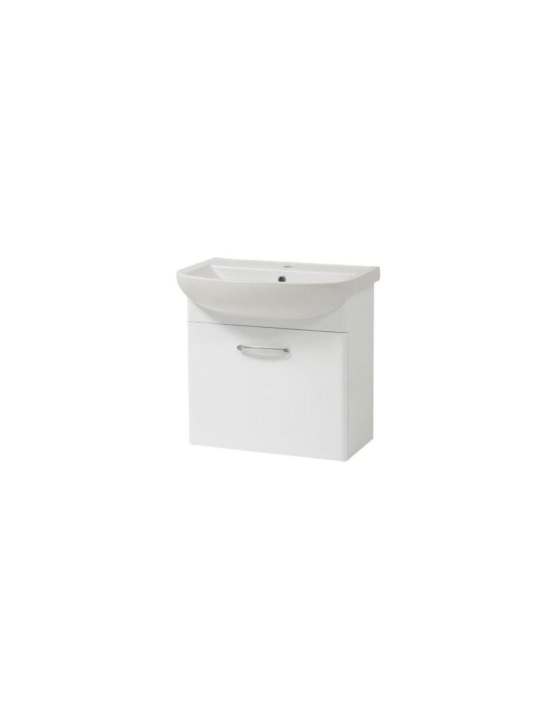 Lissabon komplet badmiljø med underskab og håndvask, udført i et design af hvid højglans og hvid porcelæn. Badmiljøet måler 60 cm i bredden, 58,5 cm i højden og 43,5 cm i dybden.