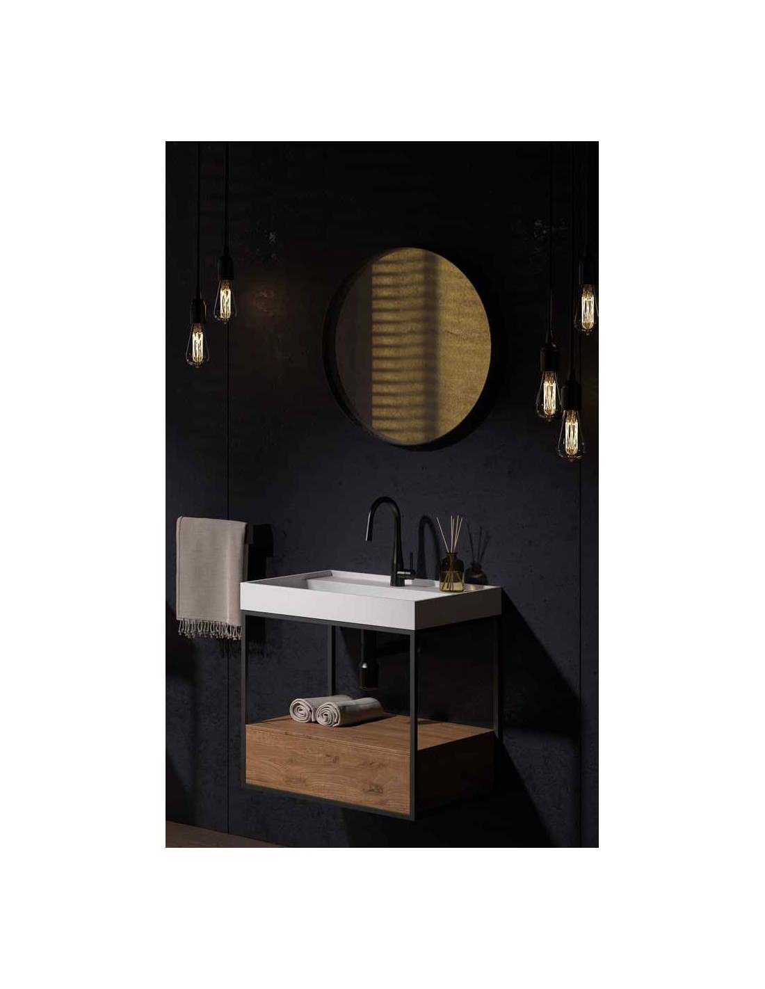 Tribeca væghængt badmiljø med underskab med skuffe, håndvask med bundventil samt afløb. Bamiljøet måler 60 cm i bredden og 61 cm i højden. Underskabet er udført i mat sortlakeret metal med push-open skuffe i nøddebrun MDF. Håndvasken er i mat hvid Solidacryl med mat sort pop-up bundventil og uden overløb. Dertil medfølger afløb i mat sort. Håndvasken er med 1 forboret hanehul. Ønskes der ikke forboret hanehul, så kontakt os endelig, men påregn en øget leveringstid. Ønskes der bundventil i mat hvid istedet, angives dette blot ved bestilling.