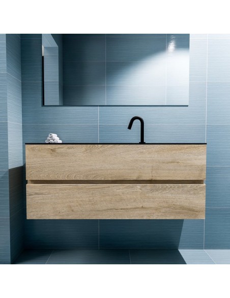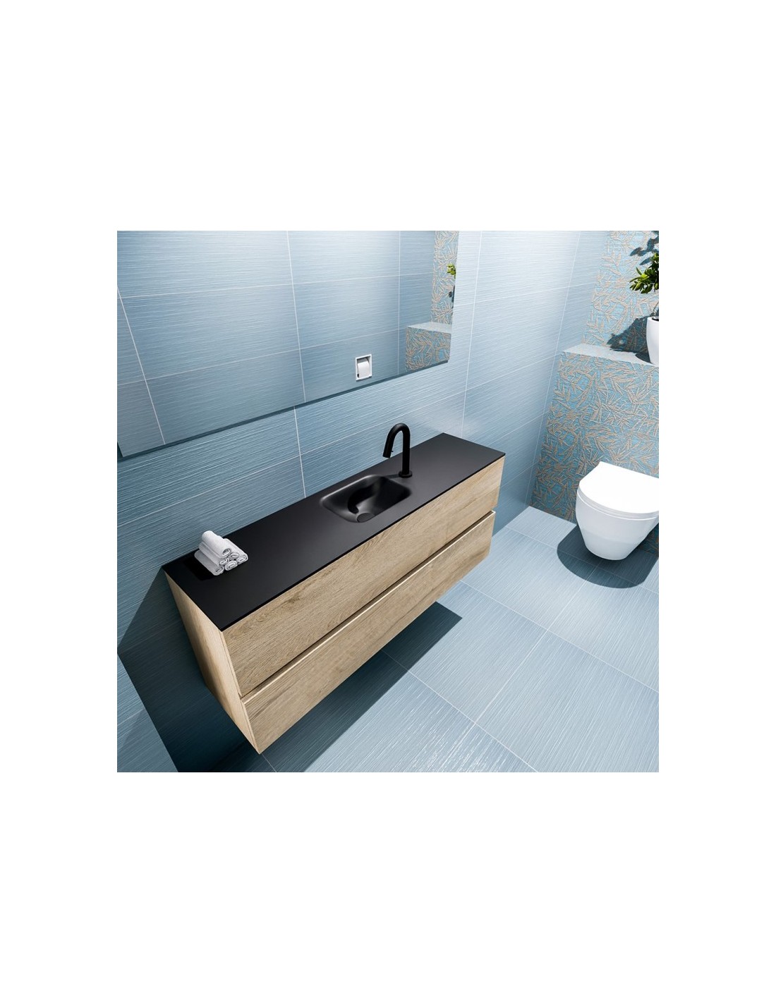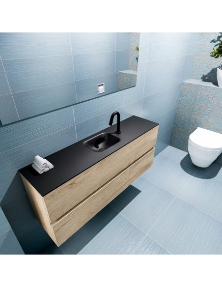 ADA Komplet badmiljø med centreret håndvask til bordmonteret armatur. Badmiljøet kommer med 2 skuffer med fuldt udtræk, og er fremstillet i MDF med design af vasket eg. Håndvasken er fremstillet i sort solid surface. Badmiljøet måler 120 x 50 cm i bredde og højde. Det viste armatur medfølger ikke i sættet.