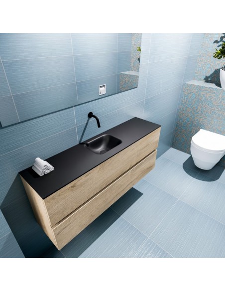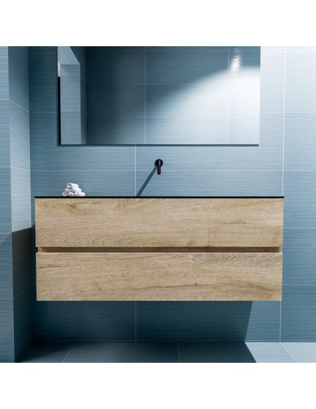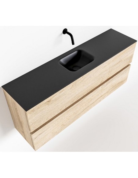 ADA Komplet badmiljø med centreret håndvask til vægmonteret armatur. Badmiljøet kommer med 2 skuffer med fuldt udtræk, og er fremstillet i MDF med design af vasket eg. Håndvasken er fremstillet i sort solid surface. Badmiljøet måler 120 x 50 cm i bredde og højde. Det viste armatur medfølger ikke i sættet.