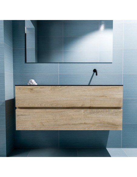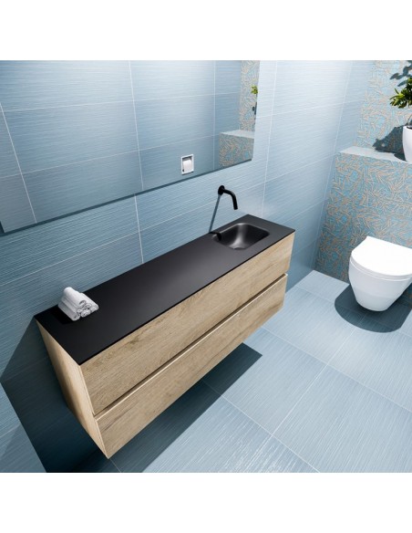 ADA Komplet badmiljø med højrevendt håndvask til vægmonteret armatur. Badmiljøet kommer med 2 skuffer med fuldt udtræk, og er fremstillet i MDF med design af vasket eg. Håndvasken er fremstillet i sort solid surface. Badmiljøet måler 120 x 50 cm i bredde og højde. Det viste armatur medfølger ikke i sættet.