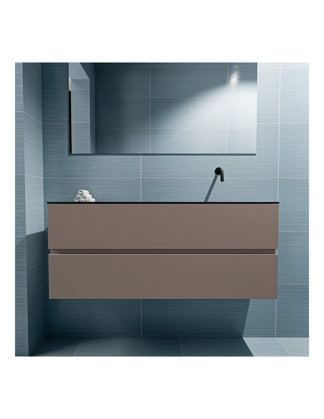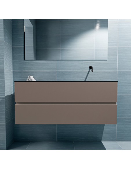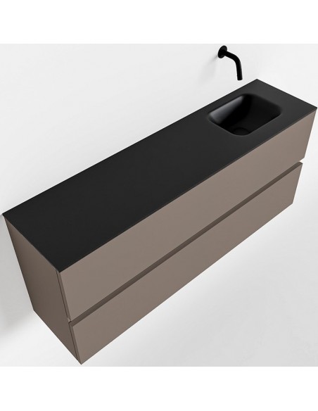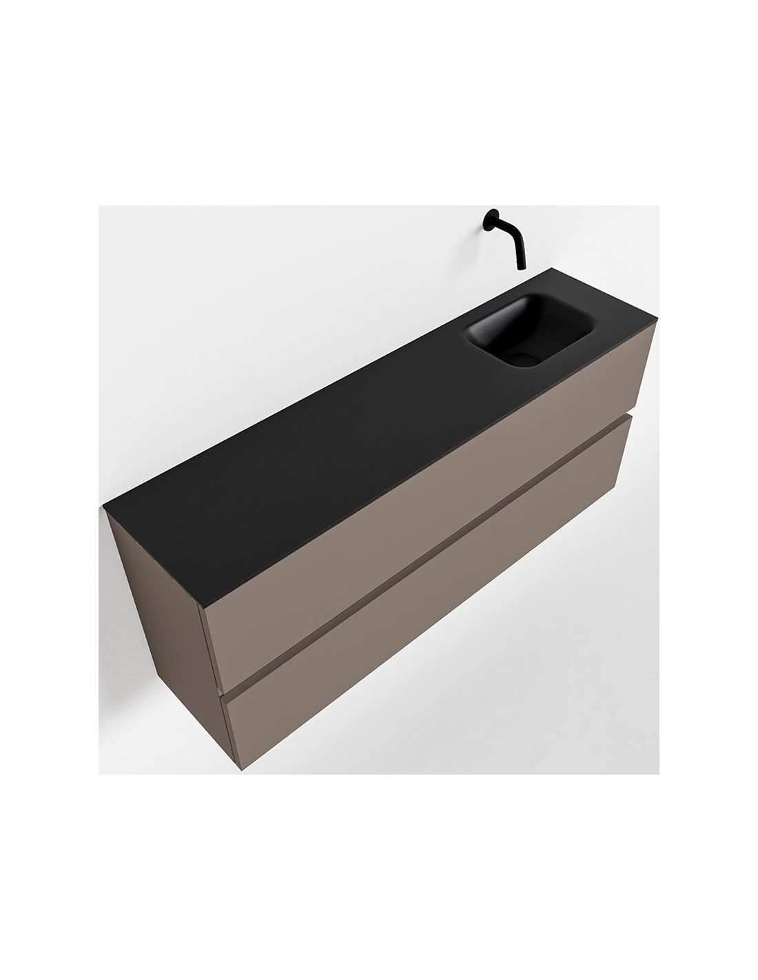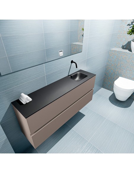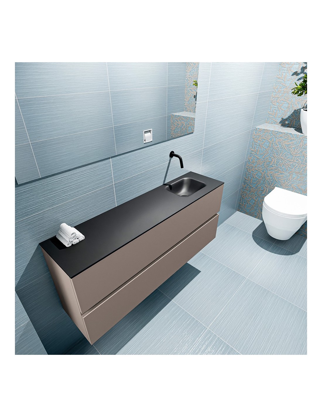 ADA Komplet badmiljø med højrevendt håndvask til vægmonteret armatur. Badmiljøet kommer med 2 skuffer med fuldt udtræk, og er fremstillet i MDF. Håndvasken er fremstillet i sort solid surface. Badmiljøet måler 120 x 50 cm i bredde og højde. Det viste armatur medfølger ikke i sættet.