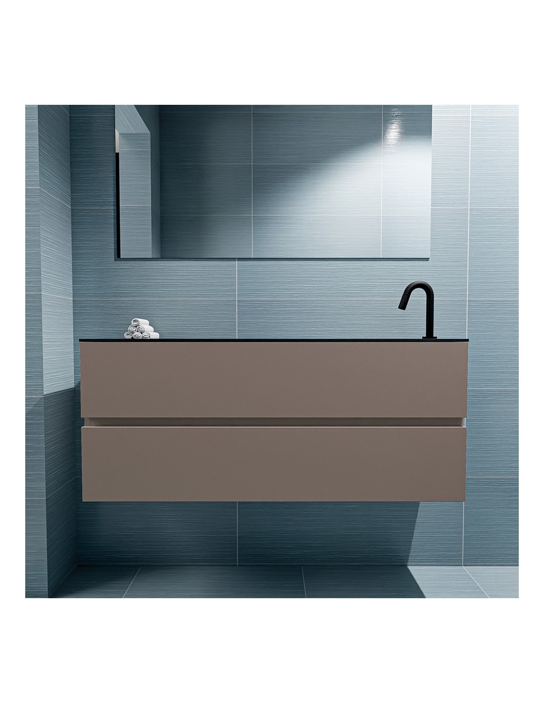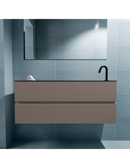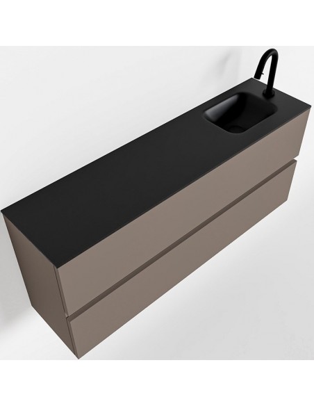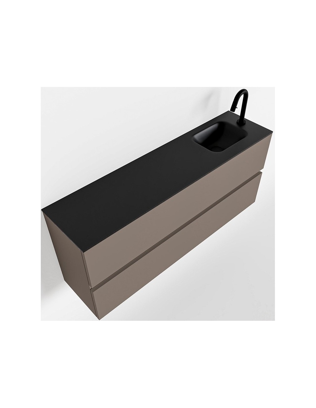 ADA Komplet badmiljø med højrevendt håndvask til bordmonteret armatur. Badmiljøet kommer med 2 skuffer med fuldt udtræk, og er fremstillet i MDF. Håndvasken er fremstillet i sort solid surface. Badmiljøet måler 120 x 50 cm i bredde og højde. Det viste armatur medfølger ikke i sættet.