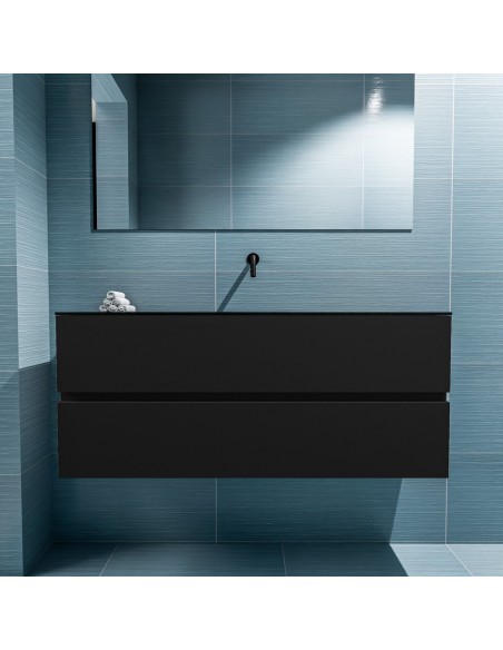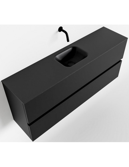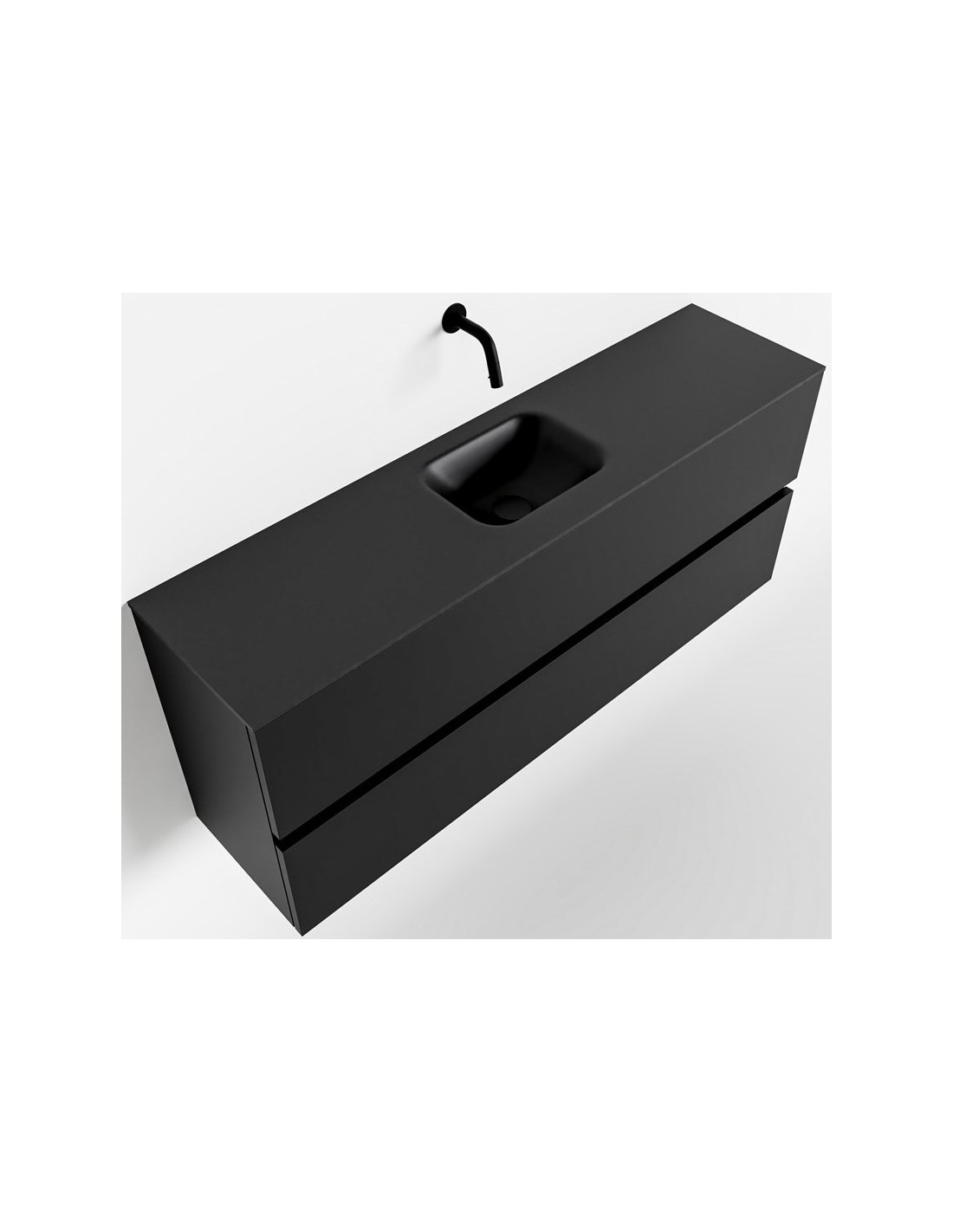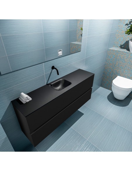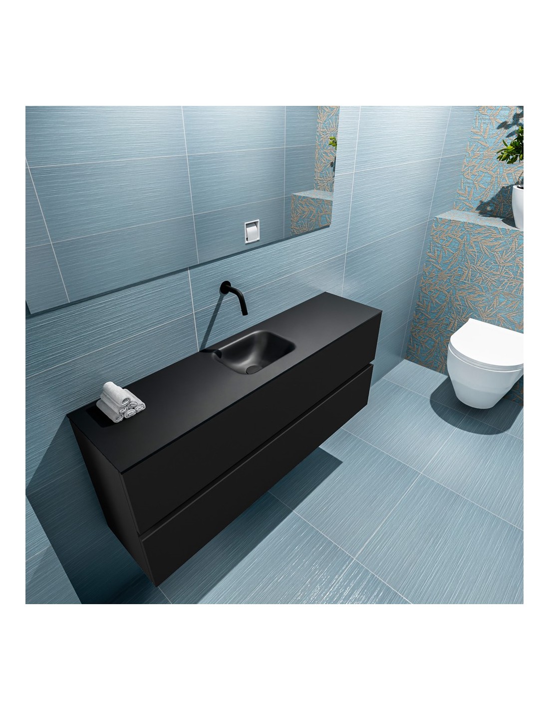 ADA Komplet badmiljø med centreret håndvask til vægmonteret armatur. Badmiljøet kommer med 2 skuffer med fuldt udtræk, og er fremstillet i MDF. Håndvasken er fremstillet i sort solid surface. Badmiljøet måler 120 x 50 cm i bredde og højde. Det viste armatur medfølger ikke i sættet.