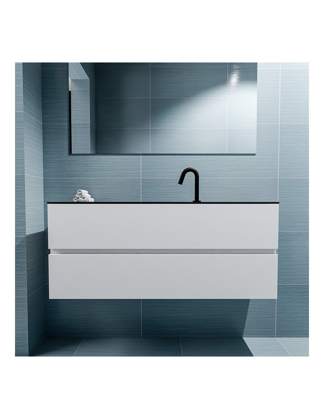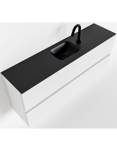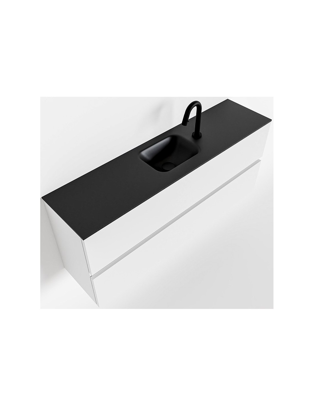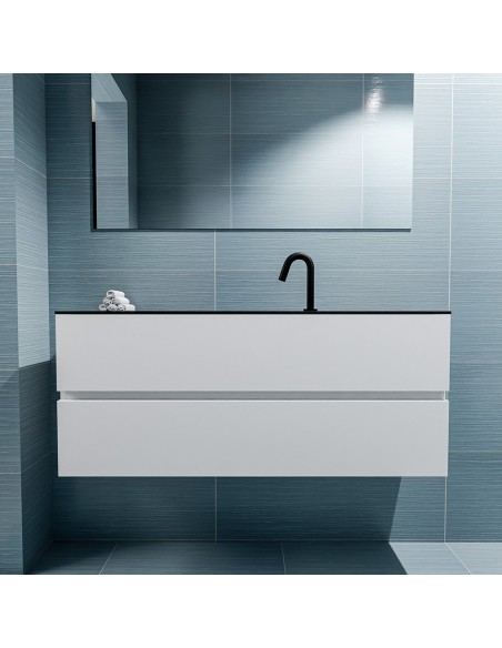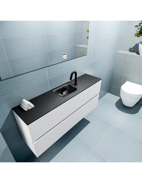 ADA Komplet badmiljø med centreret håndvask til bordmonteret armatur. Badmiljøet kommer med 2 skuffer med fuldt udtræk, og er fremstillet i MDF. Håndvasken er fremstillet i sort solid surface. Badmiljøet måler 120 x 50 cm i bredde og højde. Det viste armatur medfølger ikke i sættet.