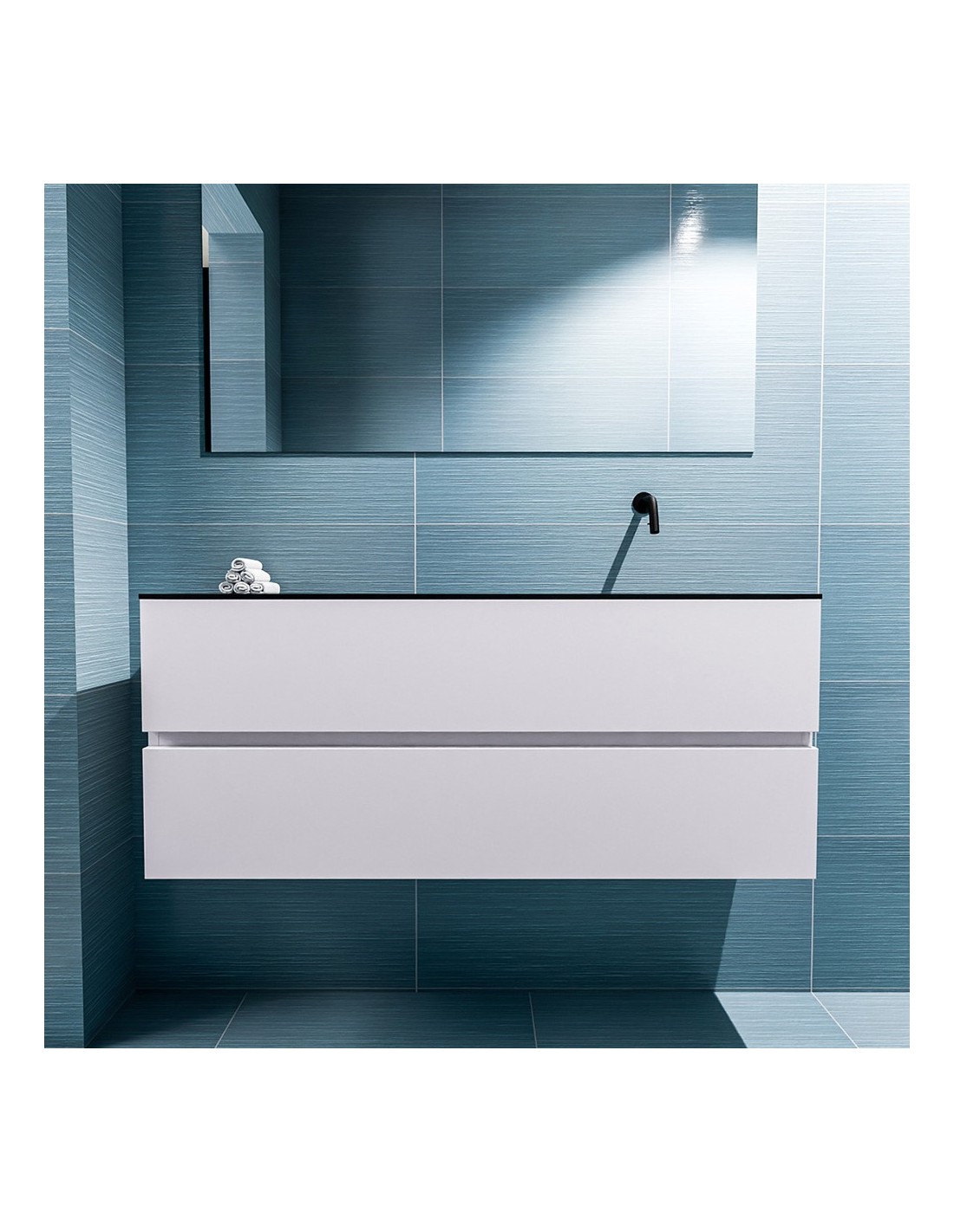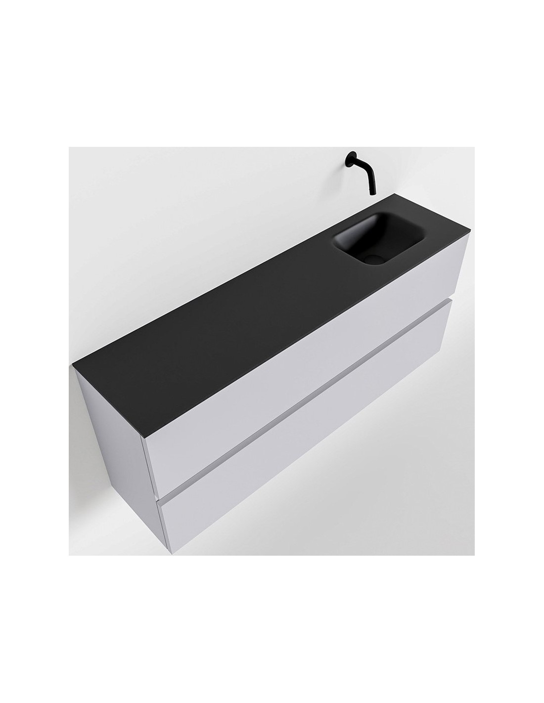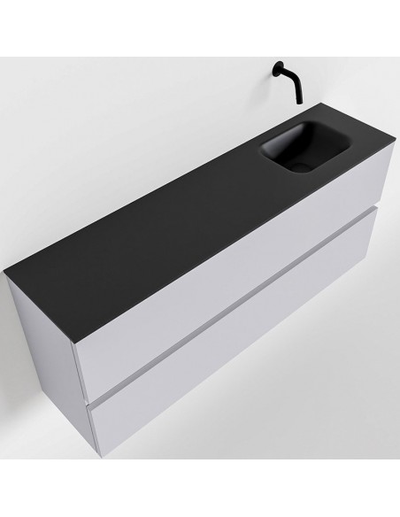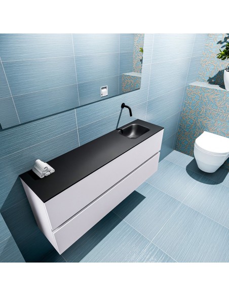 ADA Komplet badmiljø med højrevendt håndvask til vægmonteret armatur. Badmiljøet kommer med 2 skuffer med fuldt udtræk, og er fremstillet i MDF. Håndvasken er fremstillet i sort solid surface. Badmiljøet måler 120 x 50 cm i bredde og højde. Det viste armatur medfølger ikke i sættet.