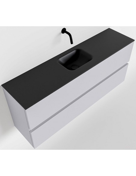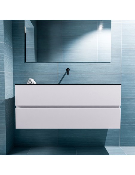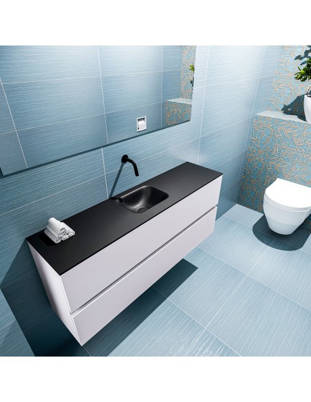ADA Komplet badmiljø med centreret håndvask til vægmonteret armatur. Badmiljøet kommer med 2 skuffer med fuldt udtræk, og er fremstillet i MDF. Håndvasken er fremstillet i sort solid surface. Badmiljøet måler 120 x 50 cm i bredde og højde. Det viste armatur medfølger ikke i sættet.