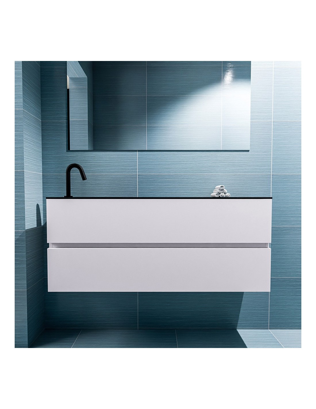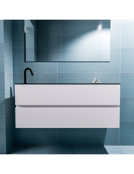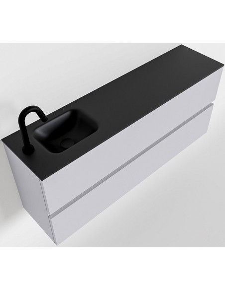 ADA Komplet badmiljø med venstrevendt håndvask til bordmonteret armatur. Badmiljøet kommer med 2 skuffer med fuldt udtræk, og er fremstillet i MDF. Håndvasken er fremstillet i sort solid surface. Badmiljøet måler 120 x 50 cm i bredde og højde. Det viste armatur medfølger ikke i sættet.