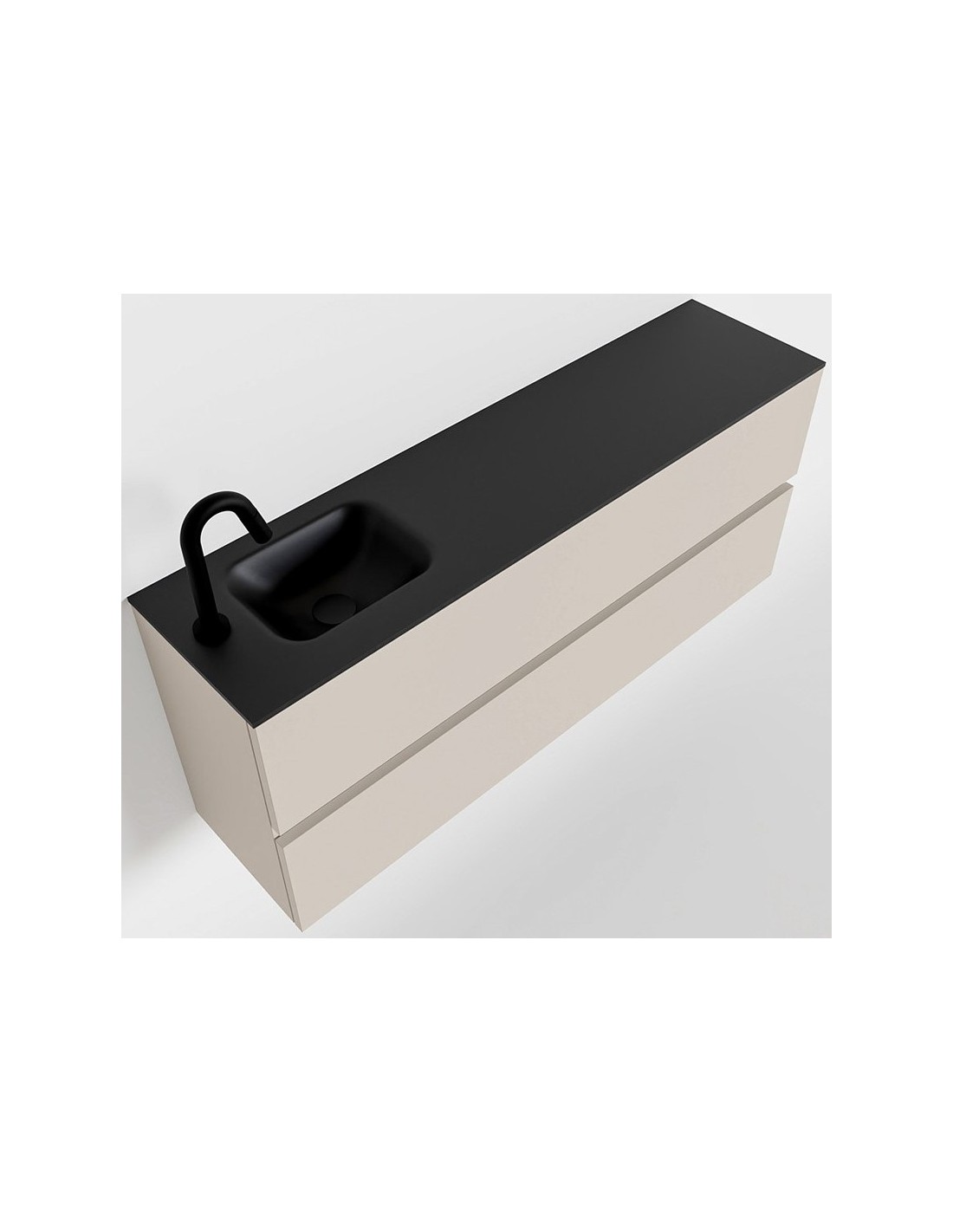 ADA Komplet badmiljø med venstrevendt håndvask til bordmonteret armatur. Badmiljøet kommer med 2 skuffer med fuldt udtræk, og er fremstillet i MDF. Håndvasken er fremstillet i sort solid surface. Badmiljøet måler 120 x 50 cm i bredde og højde. Det viste armatur medfølger ikke i sættet.
