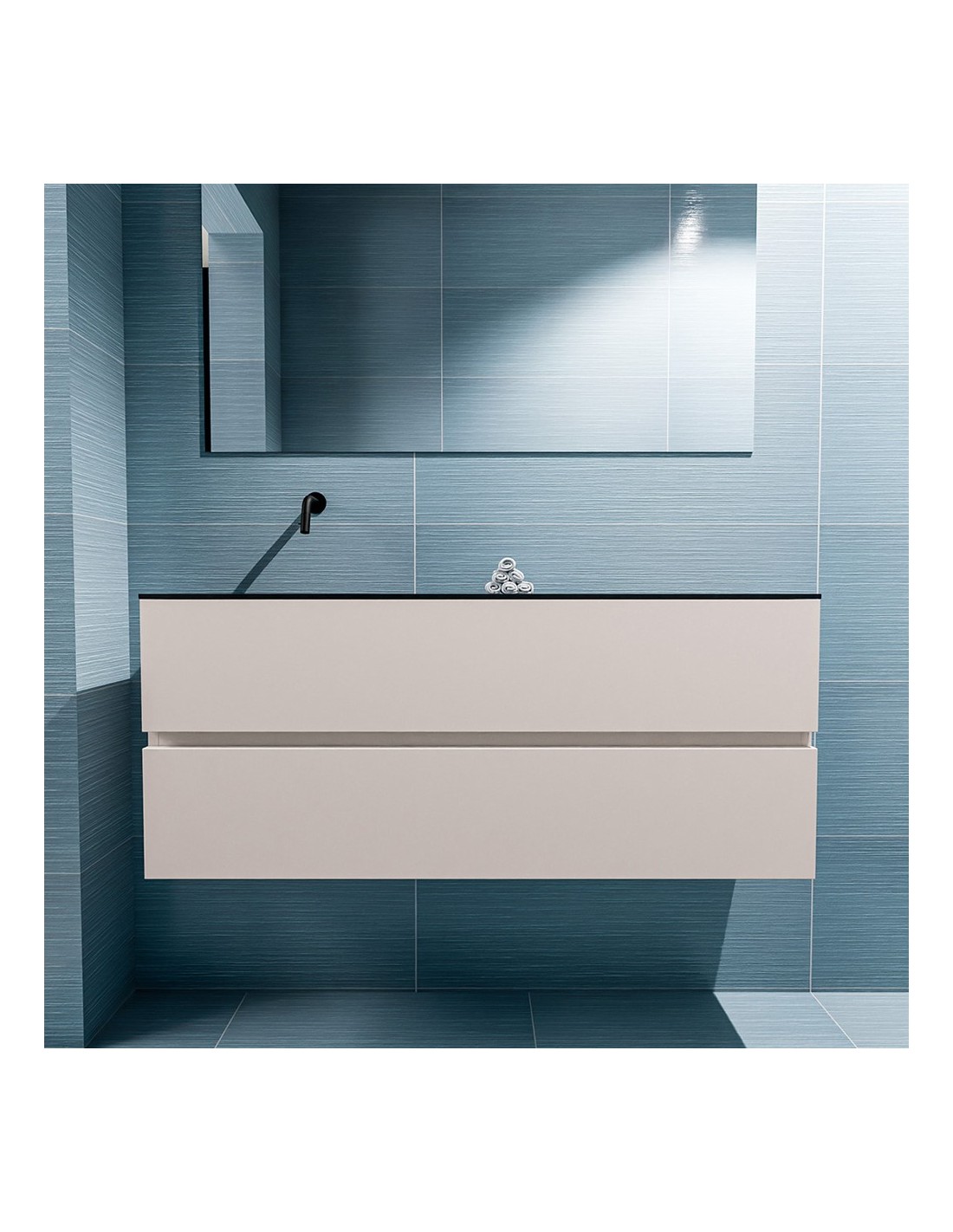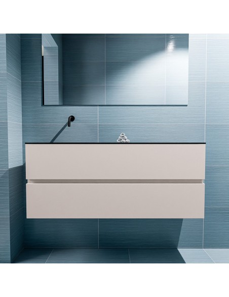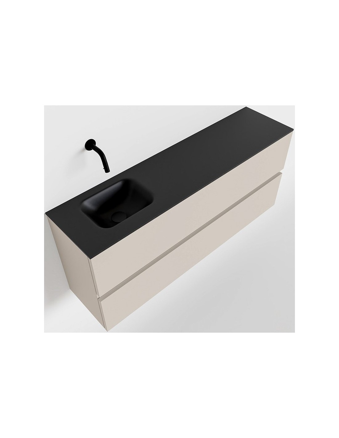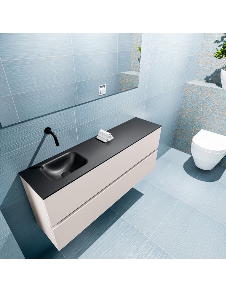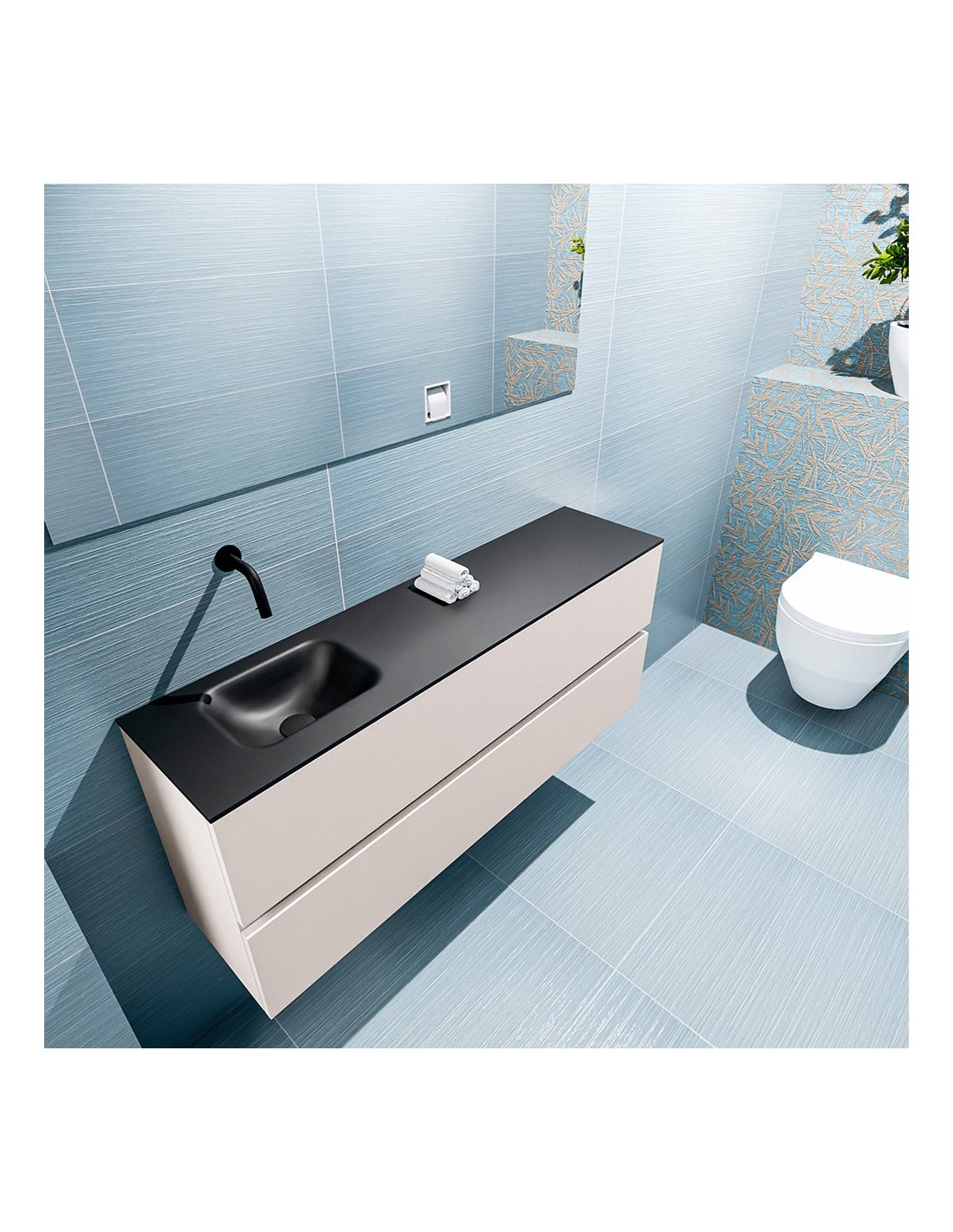 ADA Komplet badmiljø med venstrevendt håndvask til vægmonteret armatur. Badmiljøet kommer med 2 skuffer med fuldt udtræk, og er fremstillet i MDF. Håndvasken er fremstillet i sort solid surface. Badmiljøet måler 120 x 50 cm i bredde og højde. Det viste armatur medfølger ikke i sættet.