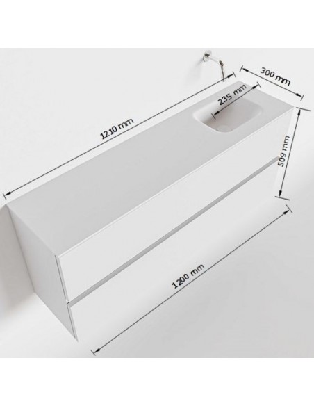ADA Komplet badmiljø med højrevendt håndvask til vægmonteret armatur. Badmiljøet kommer med 2 skuffer med fuldt udtræk, og er fremstillet i MDF. Håndvasken er fremstillet i sort solid surface. Badmiljøet måler 120 x 50 cm i bredde og højde. Det viste armatur medfølger ikke i sættet.