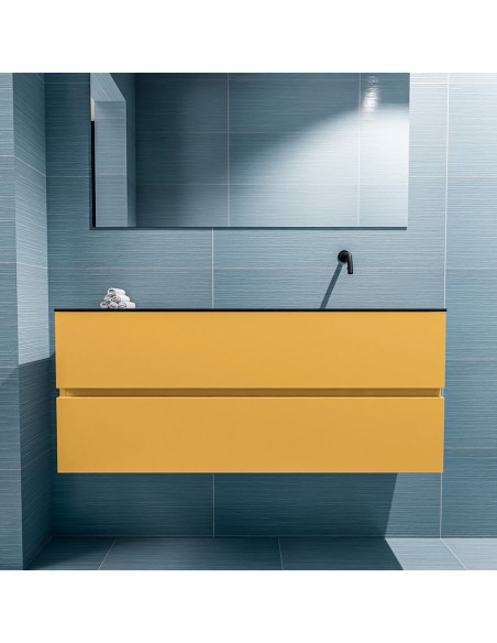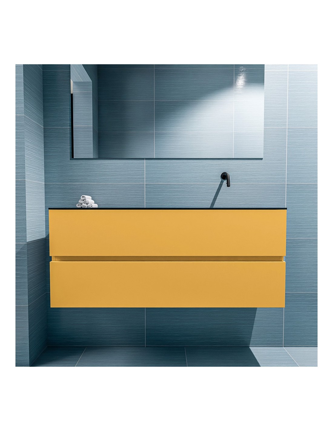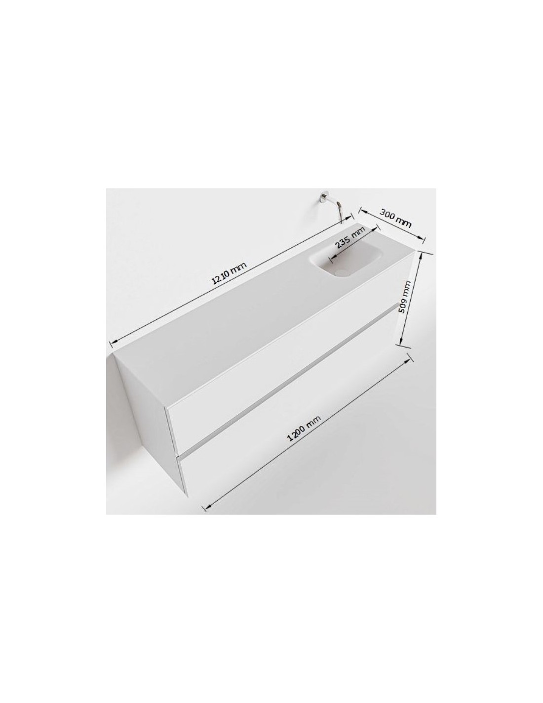 ADA Komplet badmiljø med højrevendt håndvask til vægmonteret armatur. Badmiljøet kommer med 2 skuffer med fuldt udtræk, og er fremstillet i MDF. Håndvasken er fremstillet i sort solid surface. Badmiljøet måler 120 x 50 cm i bredde og højde. Det viste armatur medfølger ikke i sættet.