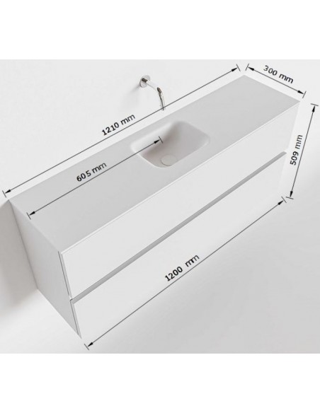 ADA Komplet badmiljø med centreret håndvask til bordmonteret armatur. Badmiljøet kommer med 2 skuffer med fuldt udtræk, og er fremstillet i MDF. Håndvasken er fremstillet i sort solid surface. Badmiljøet måler 120 x 50 cm i bredde og højde. Det viste armatur medfølger ikke i sættet.