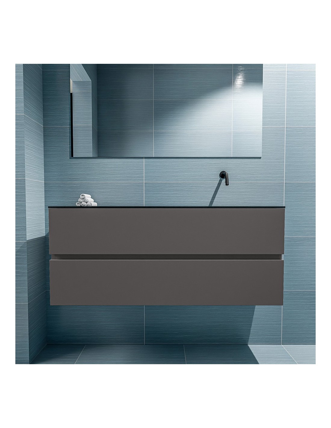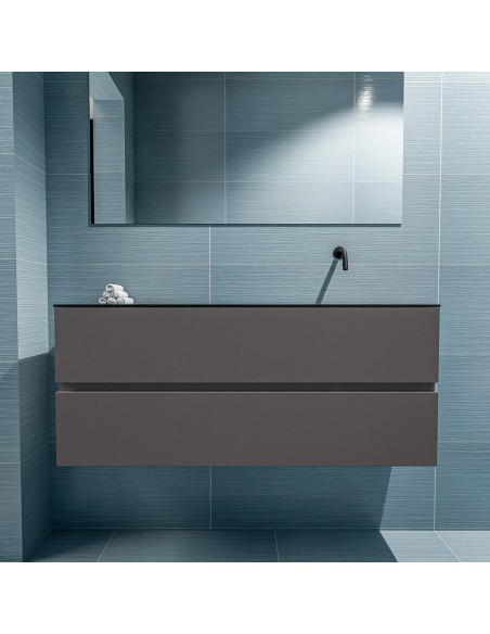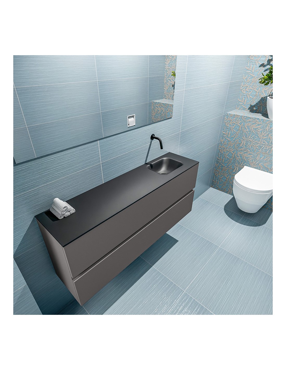 ADA Komplet badmiljø med højrevendt håndvask til vægmonteret armatur. Badmiljøet kommer med 2 skuffer med fuldt udtræk, og er fremstillet i MDF. Håndvasken er fremstillet i sort solid surface. Badmiljøet måler 120 x 50 cm i bredde og højde. Det viste armatur medfølger ikke i sættet.